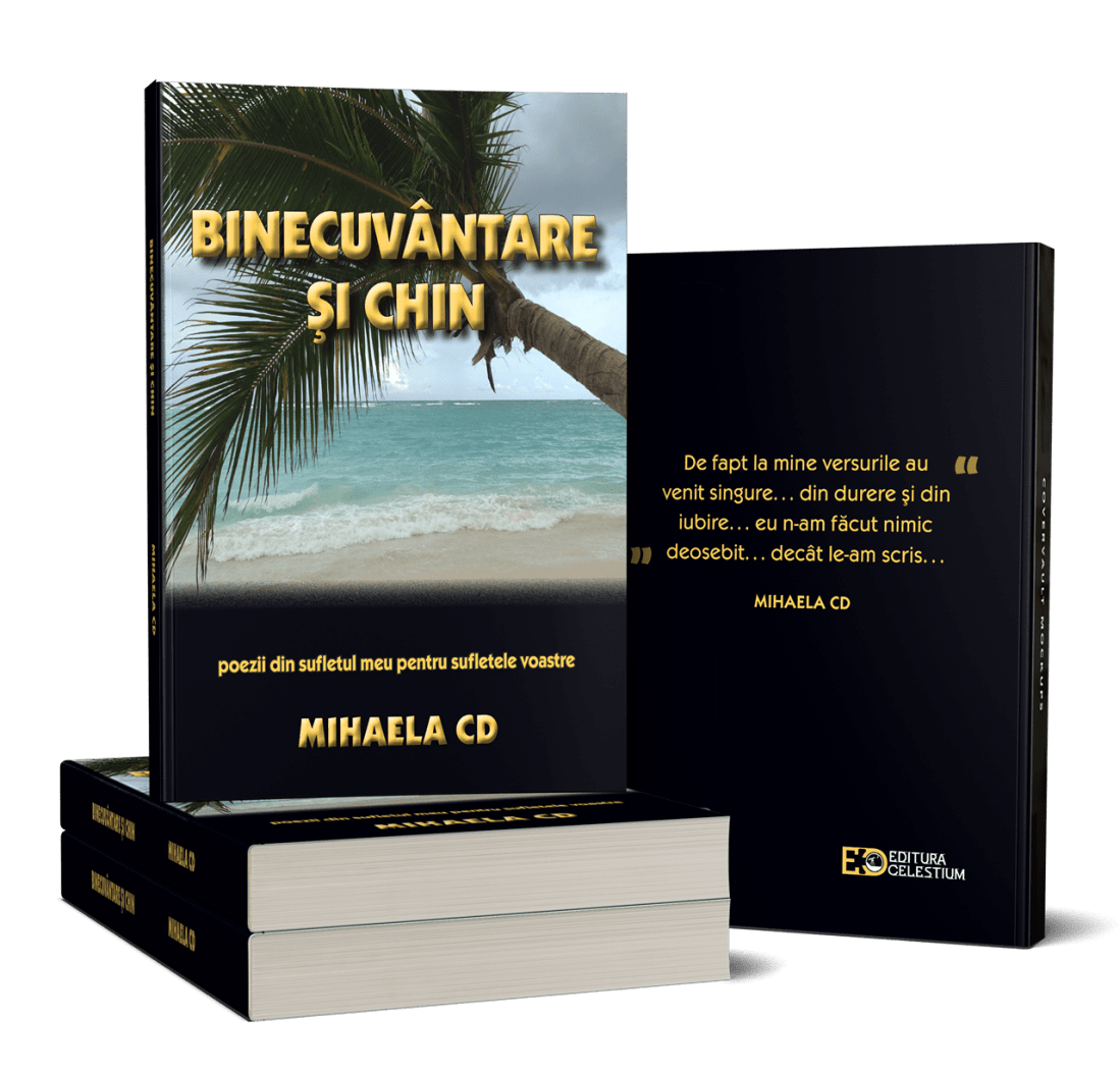 Volumul de debut al autoarei Mihaela CD, Binecuvantare si chin , ne ofera un vast buchet de sentimente parca traindu-si viata prin poezie. Volumul viu colorat contine imagini din arhiva personala. Un volum amplu, structurat in 17 capitole cu tematica diversa.Acum la un pret promotional redus cu 30% de numai 19.00$ canadieni [ 57 roni] Vei primi in dar un semn de carte si un cupon de reducere de 30% la urmatoarea carte.Primele 100 de comenzi oriunde in lume , vor avea taxa de transport inclusa in pretul cartii. Comanda acum!