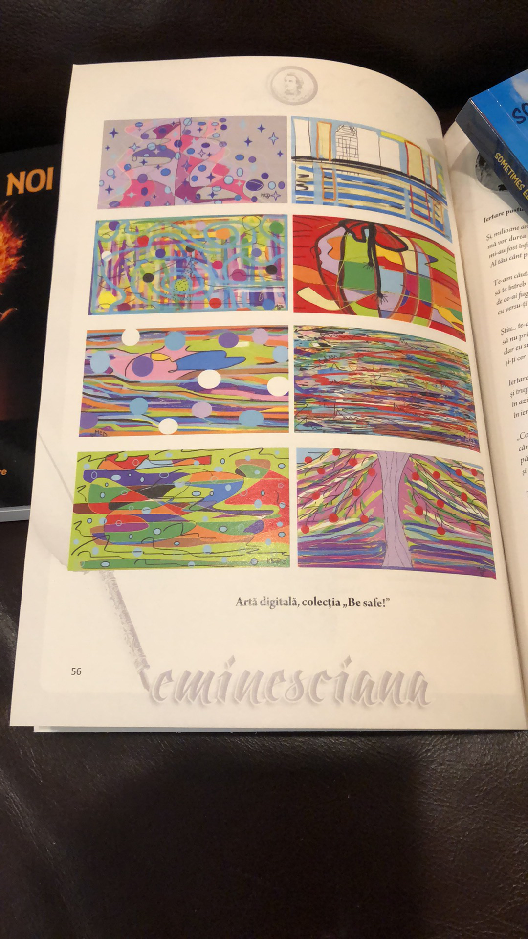 Eminesciana, ( revista fondata de Mihai Catruna artist premiat) numarul1/2021 , revista eternului frumos, la fel ca si numerele precedente pe care le-am primit , este o adevarata bijuterie culturala care iti bucura privirea in cele 96 de pagini intr-un estetic al bunului gust, greu de egalat. Rasfoiesc paginile cu bucurie si printre minunati scriitori si artisti plastici care sunt prezentati in revista, imi regasesc si eu numele. La pagina 55 gasesc 5 poezii : Esti raza mea de soare”, ”In vis sa te reintorci” , Osanda-i viata pe pamant” ”Cioburi de speranta” si ”Ademeniti de tradare” iar la pagina 56 sunt prezentate 8 dintre lucrarile mele, de arta digitala, care fac parte din colectia ”Be safe”.Culorile sunt lucioase si bine redate, ce frumos arata!