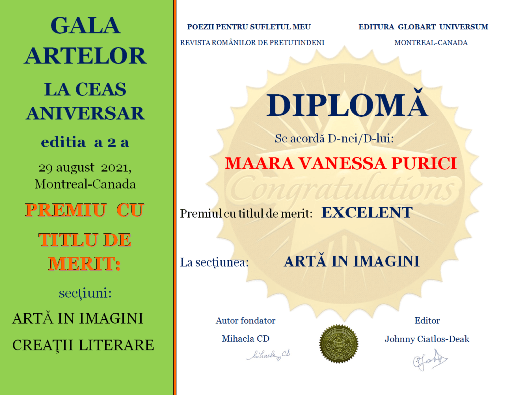 Tânăra artistă Maara Vanessa Purici s-a născut în frumosul oraș Timișoara din Romania, iar acum locuiește în Montreal împreună cu familia sa. Este pasionată de pictură, realizând atât desene și pictură tradițională cât și pictură digitală pe calculator. Maara Vanessa Purici a fost premiată la secțiunea Pictură cu diploma de Excelentă pentru merite deosebite iar la concursul Gala artelor la ceas aniversar ediția a 2-a obținut premiul EXCELENT