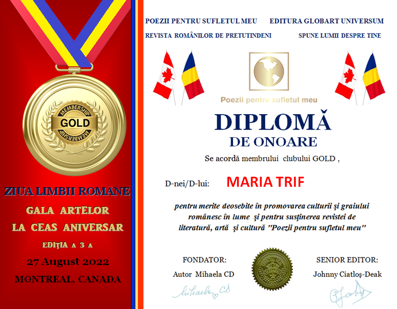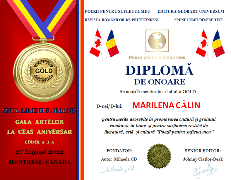 Se acorda DIPLOMA DE ONOARE pentru merite deosebite în promovarea culturii și graiului romanesc în lume și pentru susținerea revistei de literatura , arta și cultura ”Poezii pentru sufletul meu” următorilor membri ai clubului GOLD :