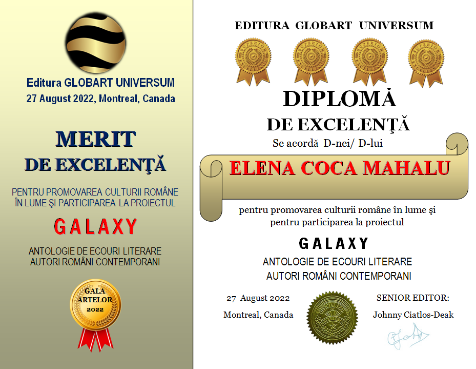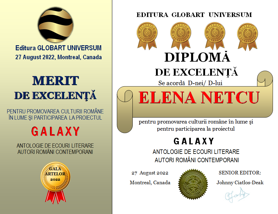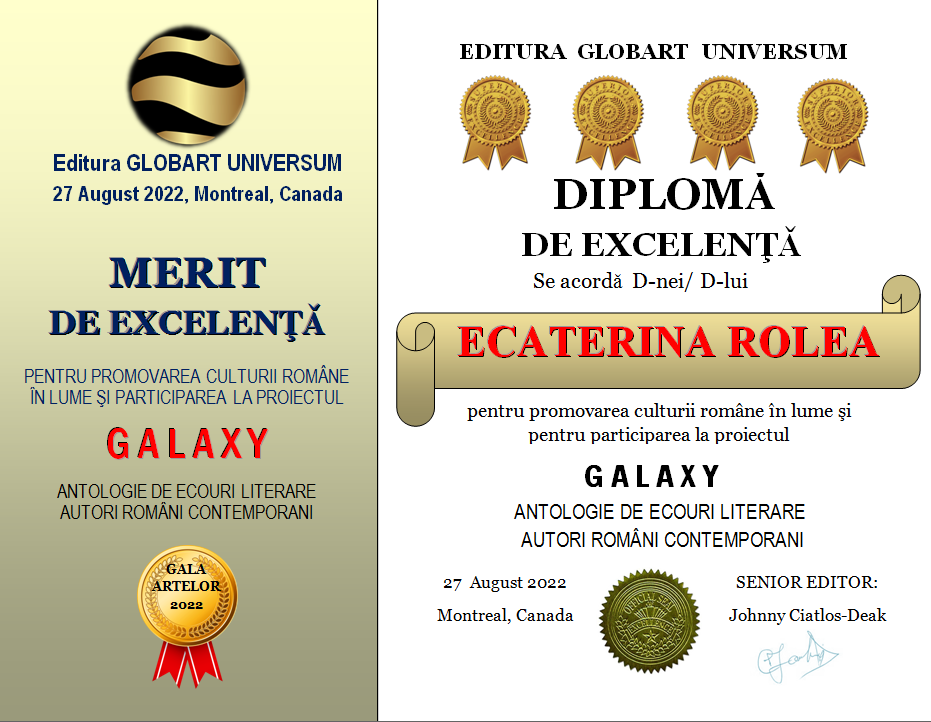Diplomele de Excelenta pentru participarea la antologia GALAXY volumele 1-2-3-4 se vor publica în perioada 27 august -5 septembrie 2022 , în ordine alfabetica după prenume (numele MIC) nu după numele de familie.