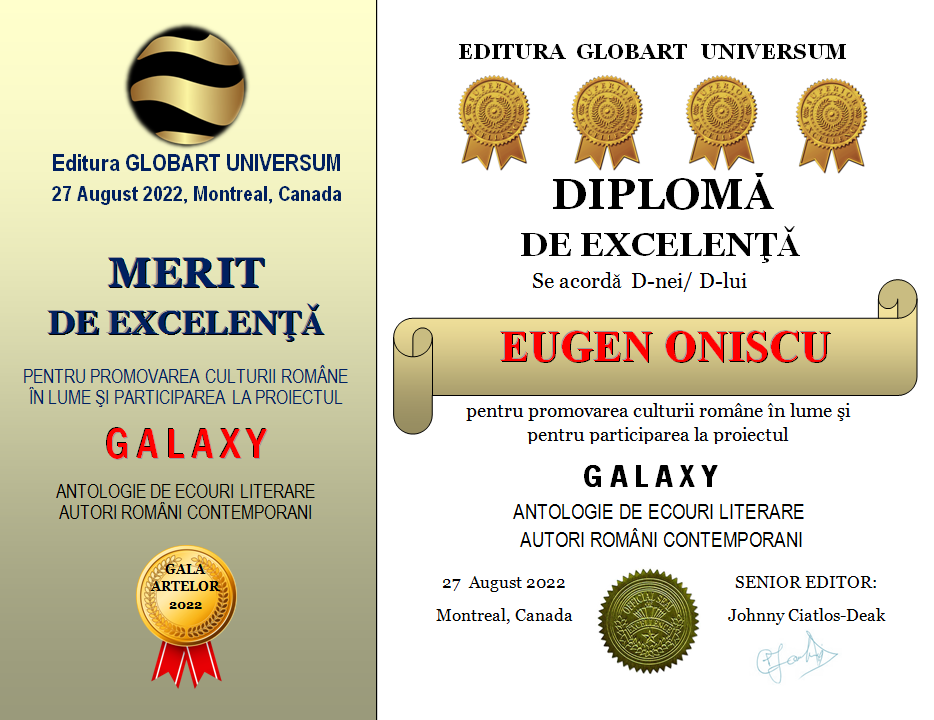 In cadrul GALEI ARTELOR ediția a 3-a 2022 editura Globart Universum va decerna Diplome de Excelenta scriitorilor care au participat la antologia GALAXY-ecouri literare în 4 volume