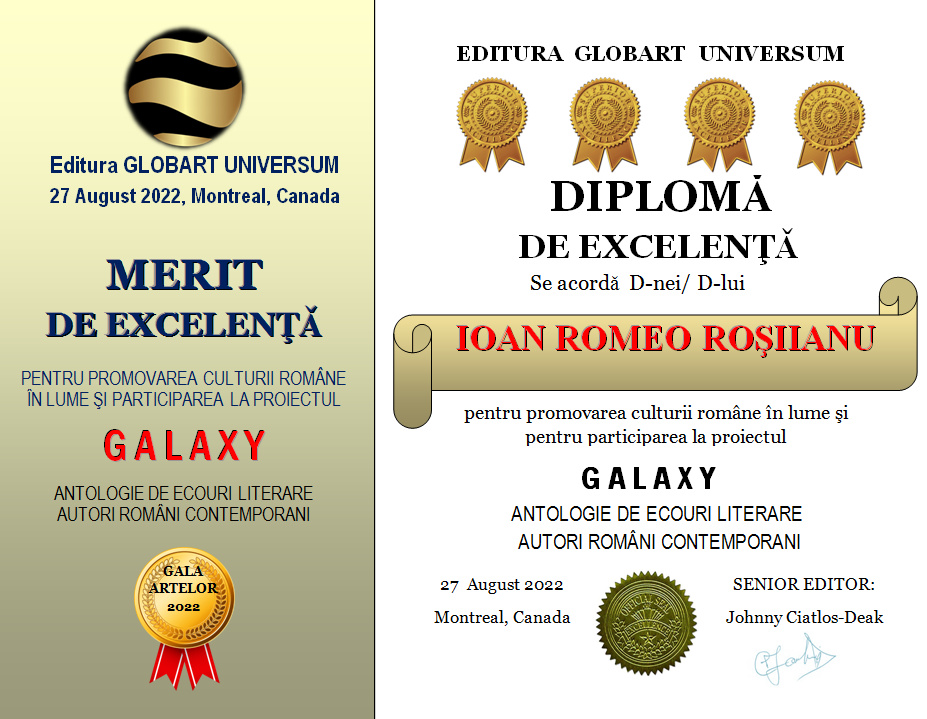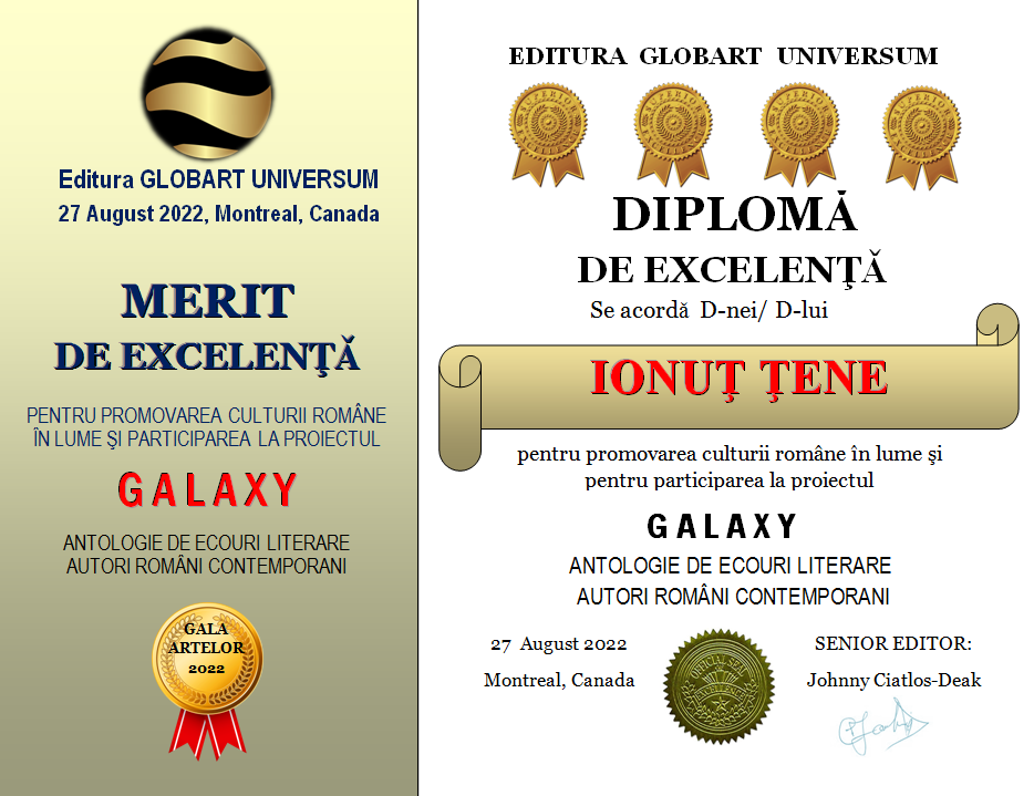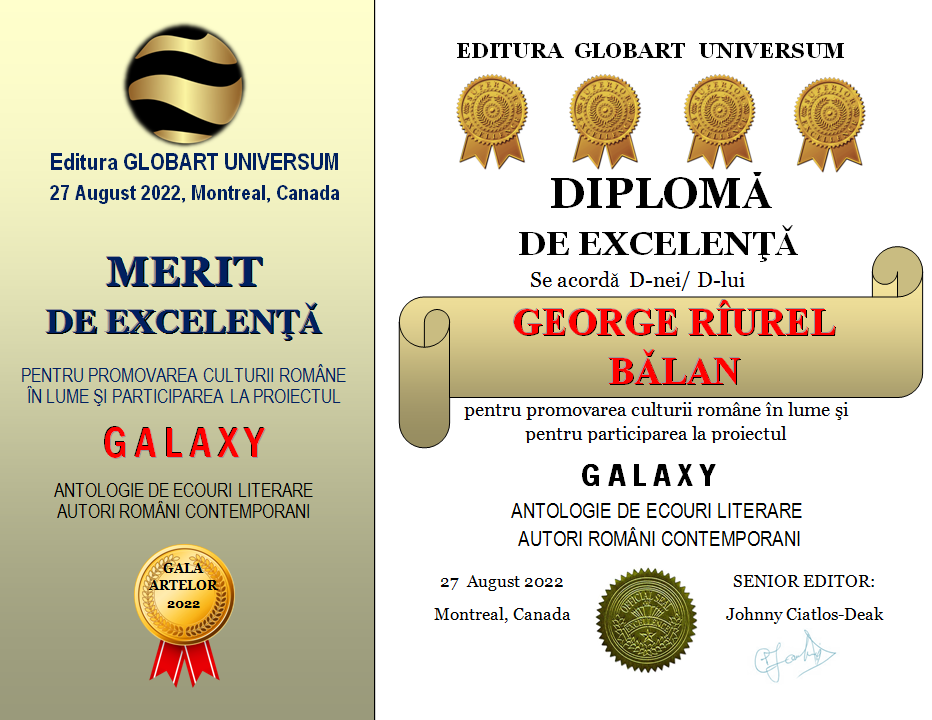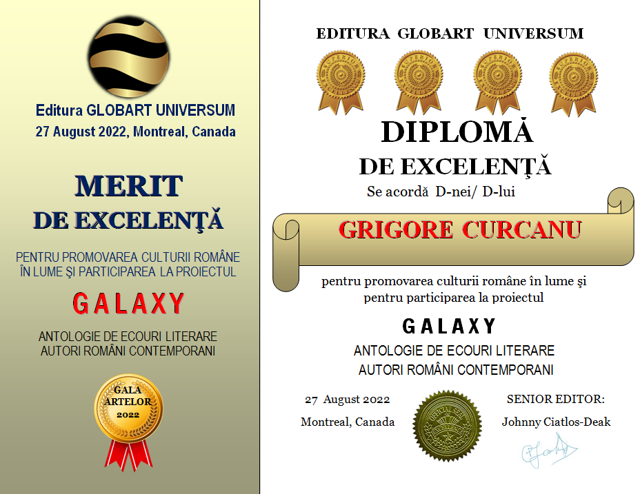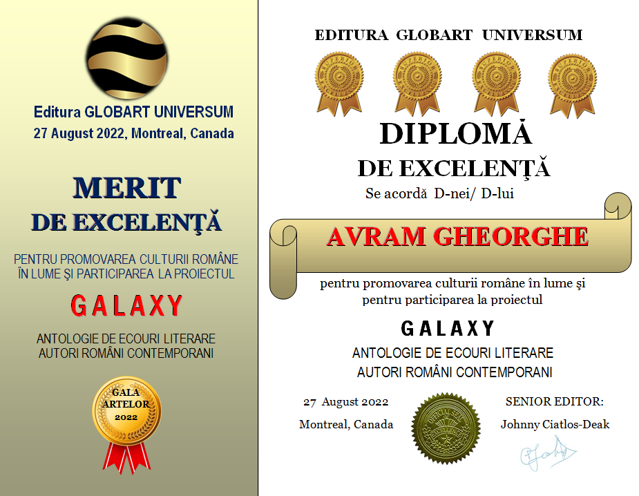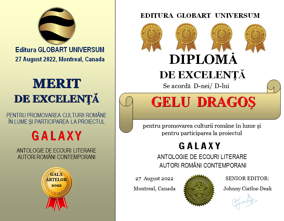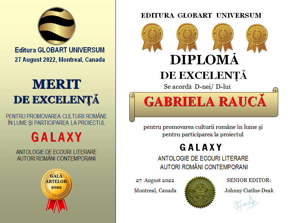 In cadrul GALEI ARTELOR ediția a 3-a 2022 editura Globart Universum va decerna Diplome de Excelenta scriitorilor care au participat la antologia GALAXY-ecouri literare în 4 volume