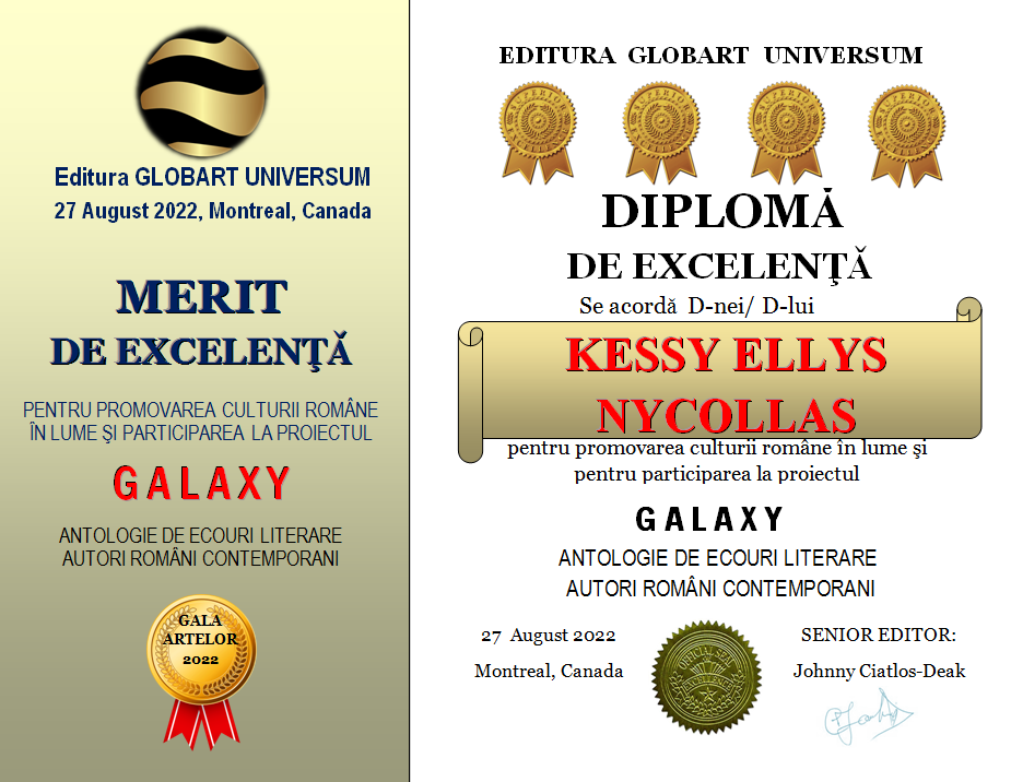 Diplomele de Excelenta pentru participarea la antologia GALAXY volumele 1-2-3-4 se vor publica în perioada 27 august -5 septembrie 2022 , în ordine alfabetica după prenume (numele MIC) nu după numele de familie.