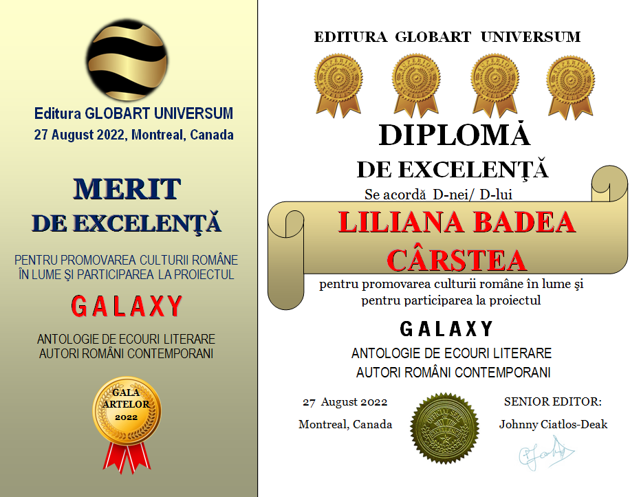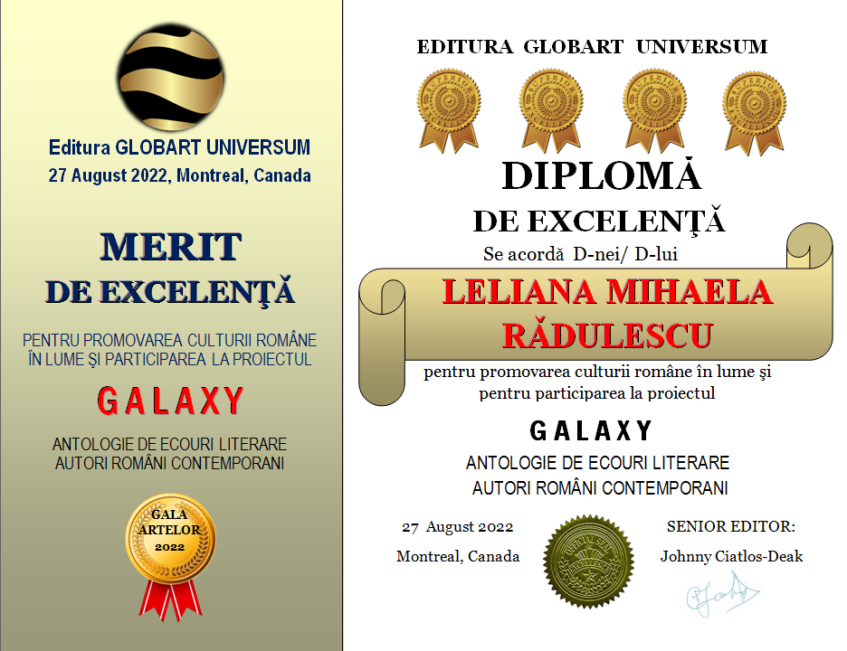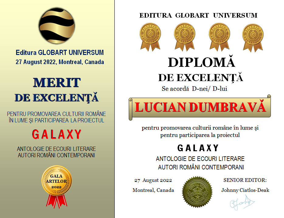 In cadrul GALEI ARTELOR ediția a 3-a 2022 editura Globart Universum va decerna Diplome de Excelenta scriitorilor care au participat la antologia GALAXY-ecouri literare în 4 volume