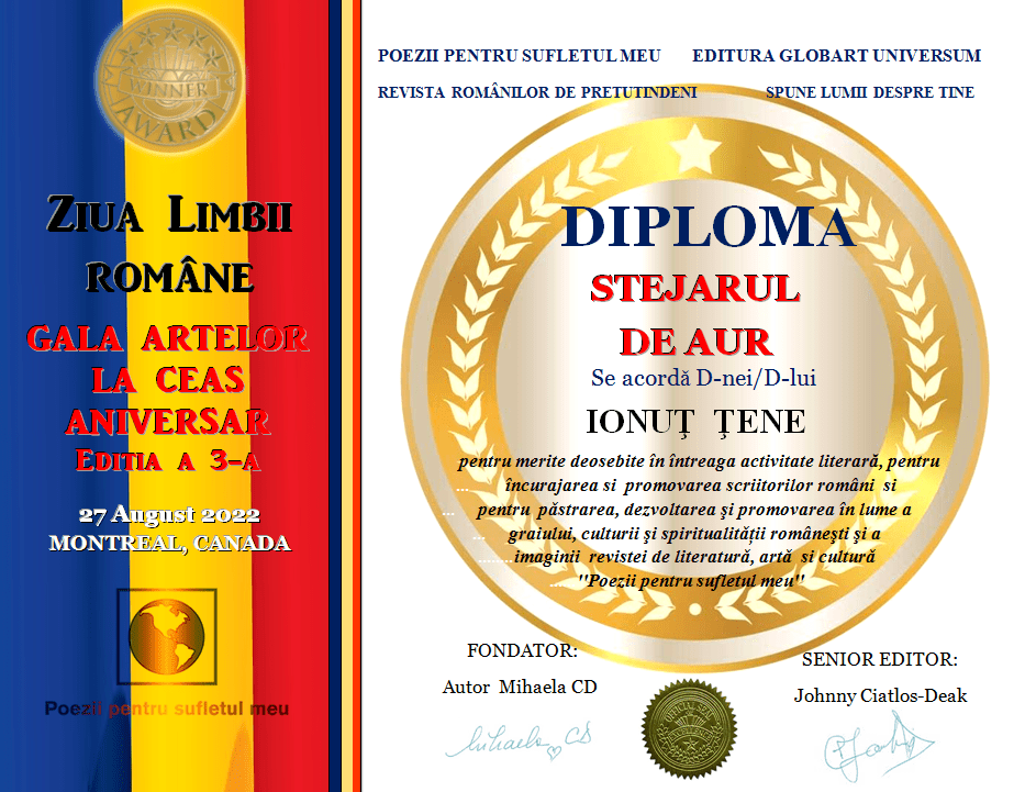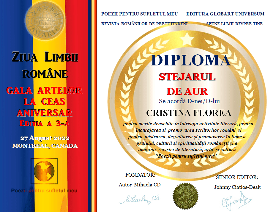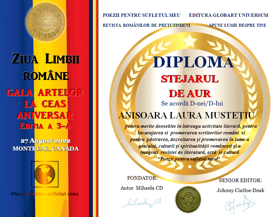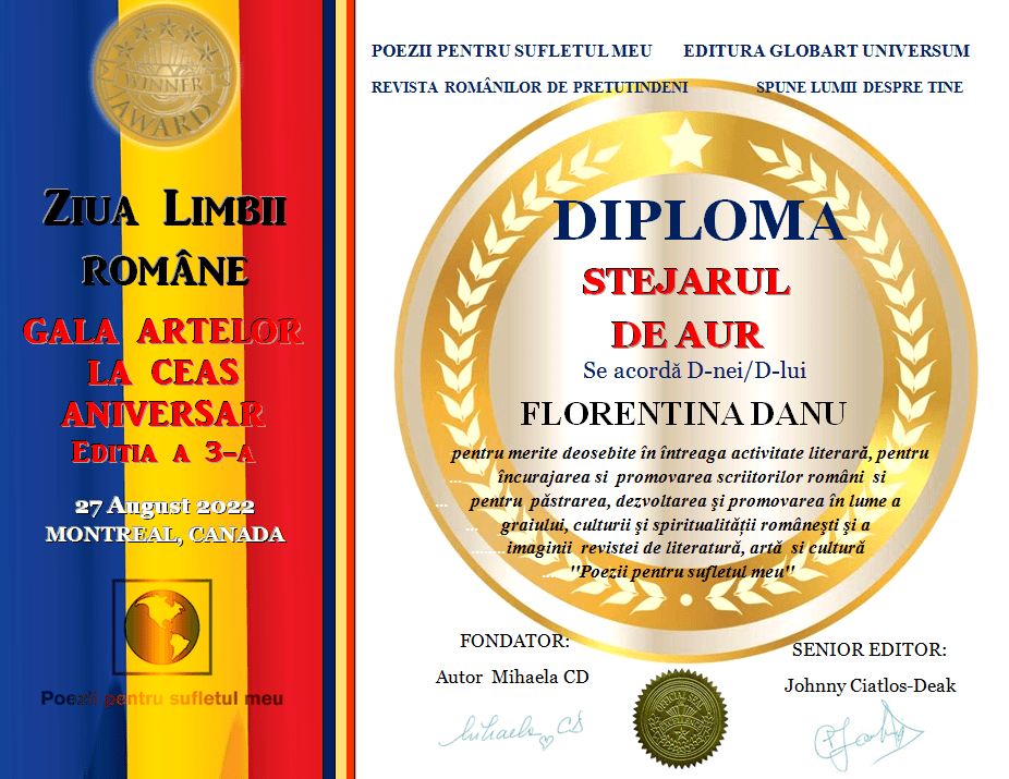 In cadrul GALEI ARTELOR  ediția a 3-a 2022 revista Poezii  pentru sufletul meu  împreună cu editura Globart Universum a decernat următoarele  diplome: