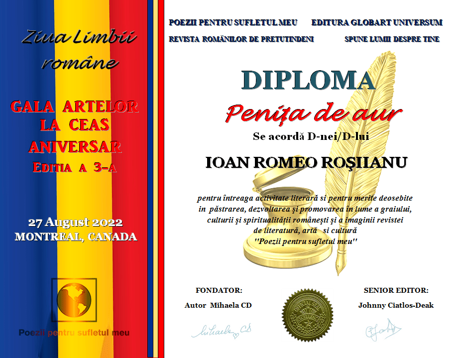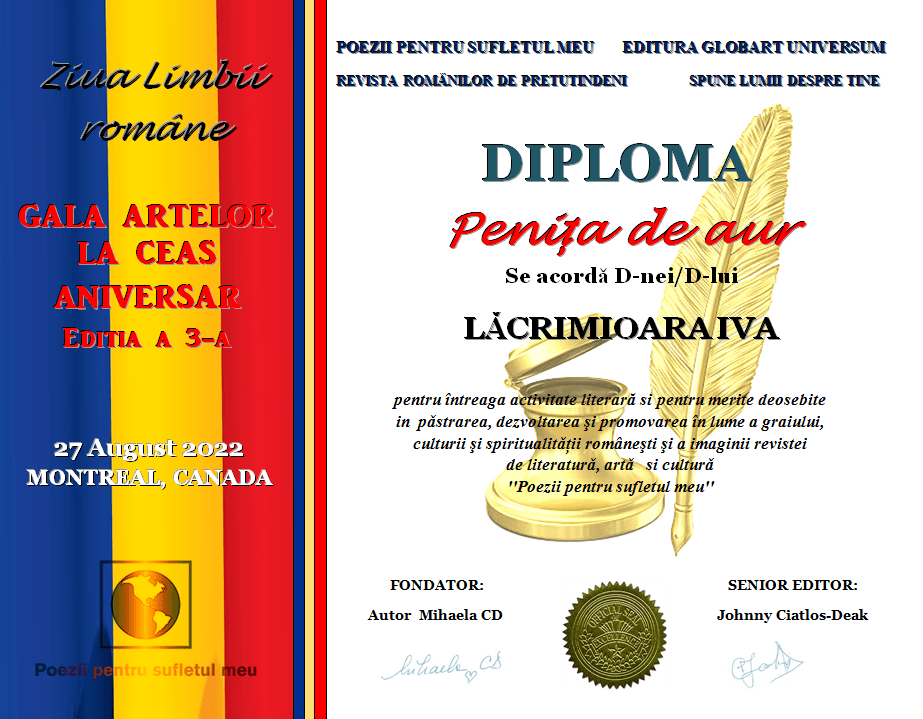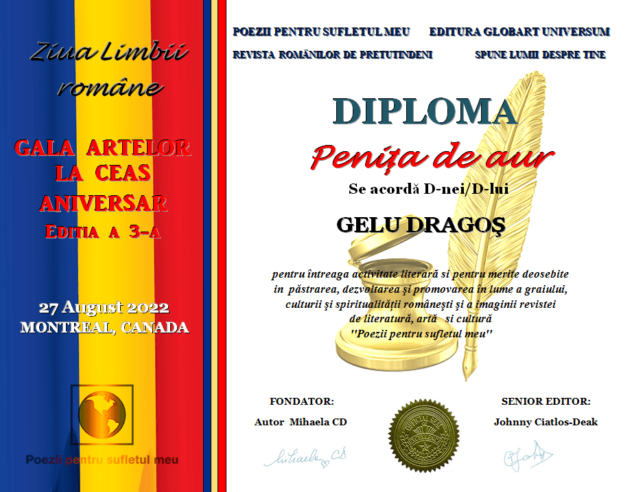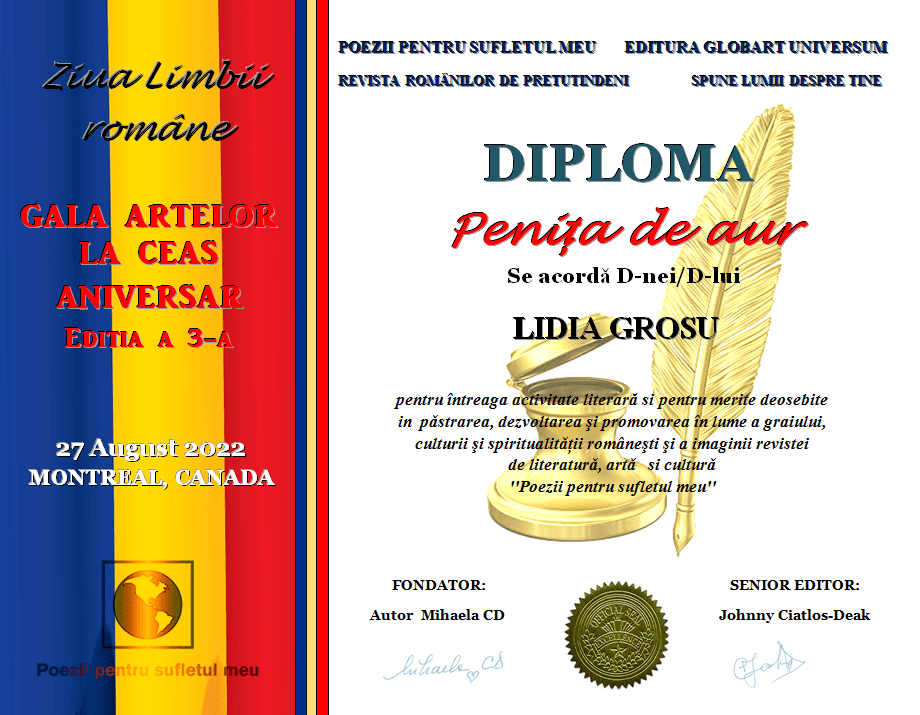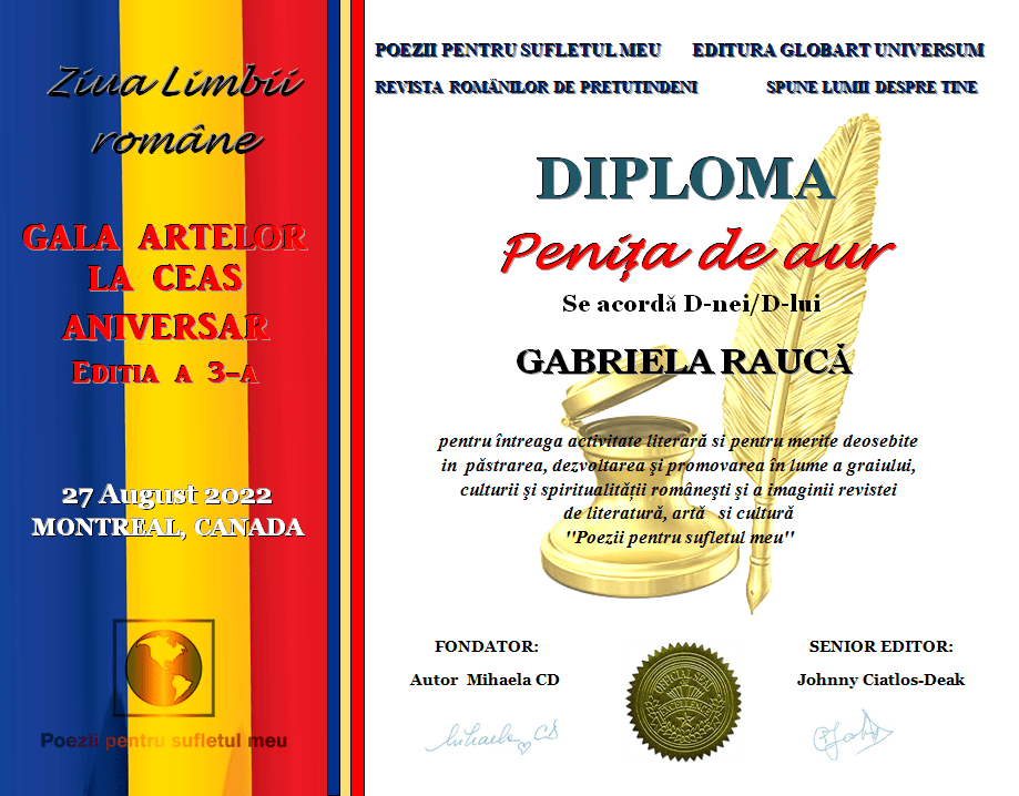 In cadrul GALEI ARTELOR ediția a 3-a 2022 revista Poezii pentru sufletul meu împreună cu editura Globart Universum a decernat următoarele diplome: