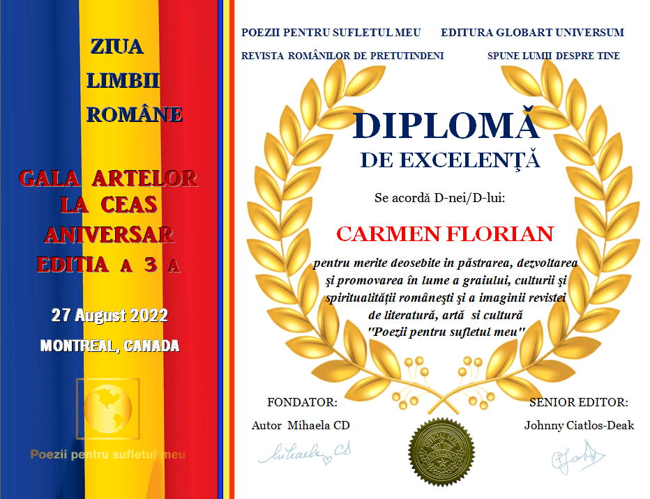 Gala ARTELOR pentru romanii de pretutindeni se desfășoară și în revista virtuala unde vor fi publicate premiilor tuturor celor care nu se afla în Montreal și care locuiesc în diverse locuri ale lumii dar care ne fac cinste și au colaborat cu revista POEZII PENTRU SUFLETUL MEU și/sau cu editura GLOBART UNIVERSUM