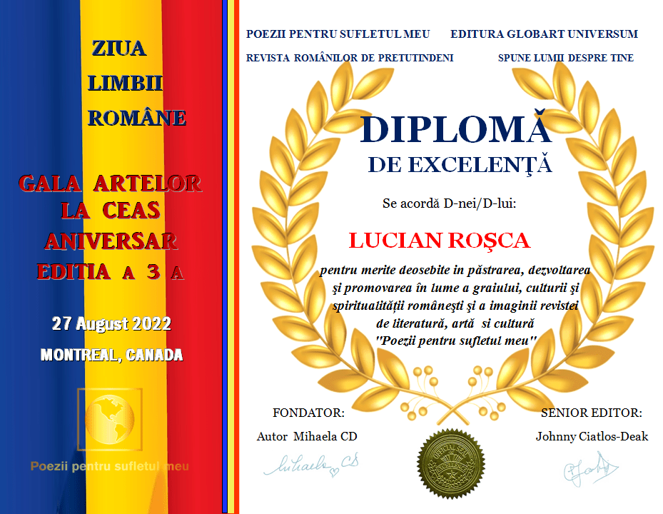 In cadrul GALEI ARTELOR ediția a 3-a 2022 revista Poezii pentru sufletul meu împreună cu editura Globart Universum a decernat următoarele diplome: