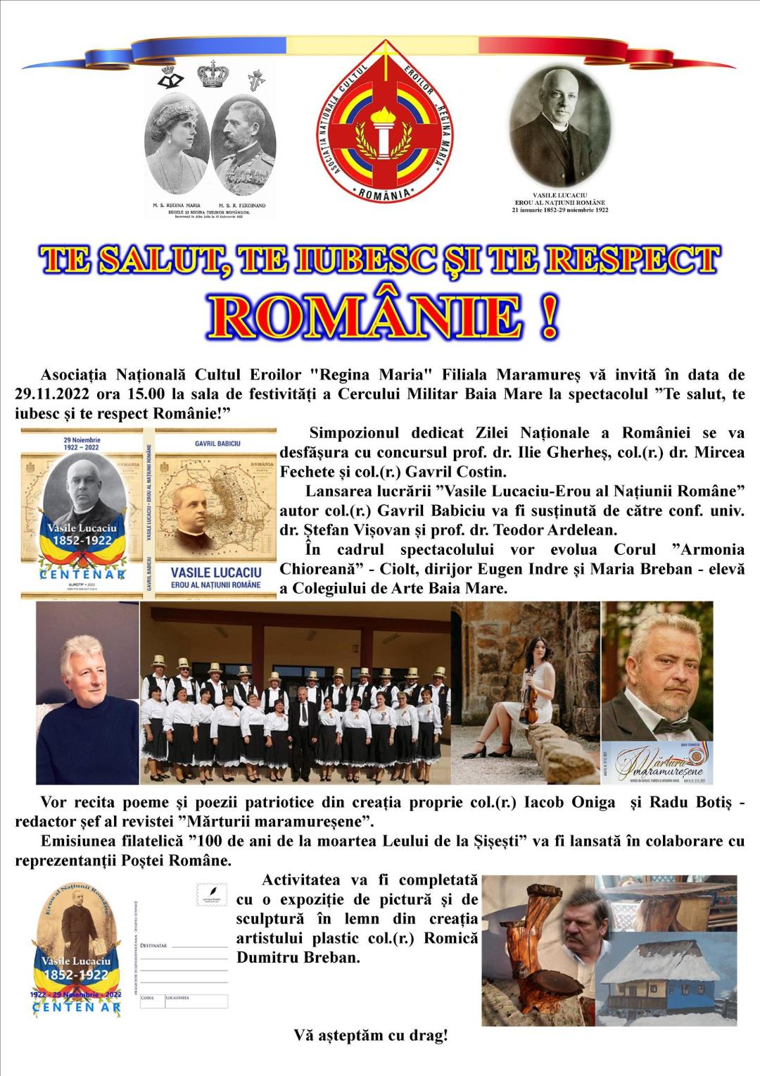 Participând cu emoție, de Ziua Națională a României, la Casa Armatei din Baia Mare, la spectacolul literar-muzical-artistic dedicat acesteia, la simpozionul dedicat lui Vasile Lucaciu și Întregitorilor Neamului Românesc, la lansarea volumului ”Vasile Lucaciu – Erou al Națiunii Române”- autor col. (r) Gavril Babiciu din Șișești, am constatat că România nu va putea fi ștearsă de pe harta pământului niciodată. Atâta timp cât sunt oameni ca cei care au participat la acest eveniment și spun cu toată ființa: ”Te salut, te iubesc și te respect Românie” în fiecare zi, atâta timp cât drapelul nu este numai pe insignele din piept sau fularele din jurul gâtului ci și în inimă, atâta timp cât armata și biserica sunt piloni ai acestui neam, România va dăinui și va MAMA bună tuturor românilor.