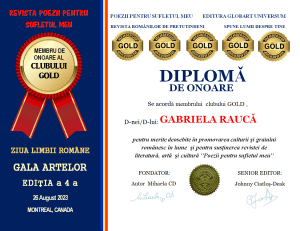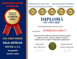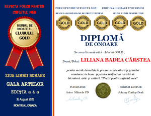 In cadrul evenimentului GALA ARTELOR  editia  a 4-a  din 26 august 2023 Editura Globart Universum din Montreal  împreuna cu revista  POEZII PENTRU SUFLETUL MEU  oferă la fel ca în fiecare an cu ocazia Galei Artelor , DIPLOME  DE ONOARE pentru SUSȚINEREA  REVISTEI TIPĂRITE și pentru  promovarea culturii  romane în lume  tuturor membrilor CLUBULUI GOLD