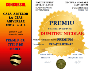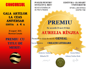 In cadrul evenimentului GALA ARTELOR ediția a 4-a din 26 august 2023 Editura Globart Universum din Montreal împreună cu revista TIPĂRITĂ POEZII PENTRU SUFLETUL MEU au organizat concursul GALA ARTELOR LA CEAS ANIVERSAR ediția a 4-a desfășurat în revista numărul 12 tipărită , concurs cu 2 secțiuni: ARTA ÎN IMAGINI și CREAȚII LITERARE.