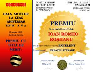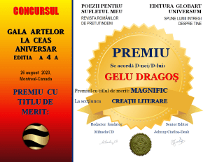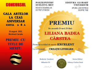 In cadrul evenimentului GALA ARTELOR ediția a 4-a din 26 august 2023 Editura Globart Universum din Montreal împreună cu revista TIPĂRITĂ POEZII PENTRU SUFLETUL MEU au organizat concursul GALA ARTELOR LA CEAS ANIVERSAR ediția a 4-a desfășurat în revista numărul 12 tipărită , concurs cu 2 secțiuni: ARTA ÎN IMAGINI și CREAȚII LITERARE.