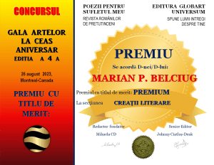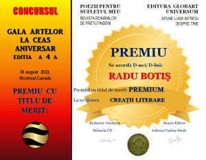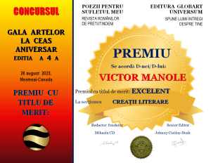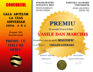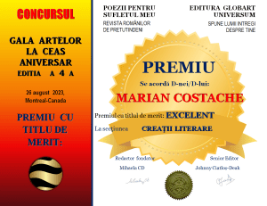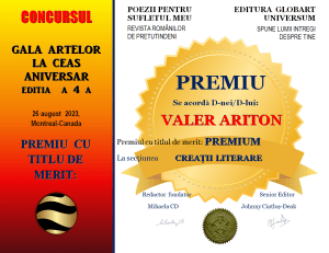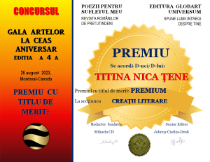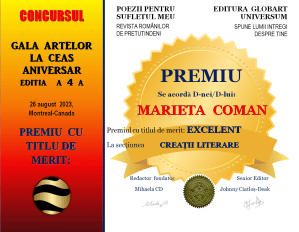 In cadrul evenimentului GALA ARTELOR ediția a 4-a din 26 august 2023 Editura Globart Universum din Montreal împreună cu revista TIPĂRITĂ POEZII PENTRU SUFLETUL MEU au organizat concursul GALA ARTELOR LA CEAS ANIVERSAR ediția a 4-a desfășurat în revista numărul 12 tipărită , concurs cu 2 secțiuni: ARTA ÎN IMAGINI și CREAȚII LITERARE.