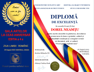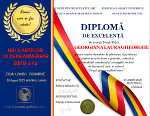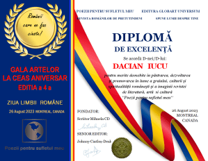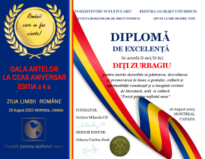 In cadrul evenimentului GALA ARTELOR ediția a 4-a din 26 august 2023 Editura Globart Universum din Montreal împreună cu revista POEZII PENTRU SUFLETUL MEU atribuie mai multe feluri de premii și diplome: Diplome de Excelenta -antologia ÎMPREUNĂ, Diplome de onoare membrilor clubului Gold, Premii Concursul GALA ARTELOR LA CEAS ANIVERSAR secțiuni CREAȚII LITERARE și ARTA ÎN IMAGINI ( revista tipărita nr 12), Diplomele PENIȚA DE AUR, Diplomele STEJARUL DE AUR, Diplome de Excelenta oferite la Evenimentul GALA ARTELOR din Montreal și Diplome de Excelenta oferite colaboratorilor din lumea întreagă.