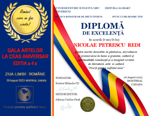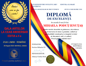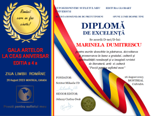 In cadrul evenimentului GALA ARTELOR ediția a 4-a din 26 august 2023 Editura Globart Universum din Montreal împreună cu revista POEZII PENTRU SUFLETUL MEU atribuie mai multe feluri de premii și diplome: Diplome de Excelenta -antologia ÎMPREUNĂ, Diplome de onoare membrilor clubului Gold, Premii Concursul GALA ARTELOR LA CEAS ANIVERSAR secțiuni CREAȚII LITERARE și ARTA ÎN IMAGINI ( revista tipărita nr 12), Diplomele PENIȚA DE AUR, Diplomele STEJARUL DE AUR, Diplome de Excelenta oferite la Evenimentul GALA ARTELOR din Montreal și Diplome de Excelenta oferite colaboratorilor din lumea întreagă.