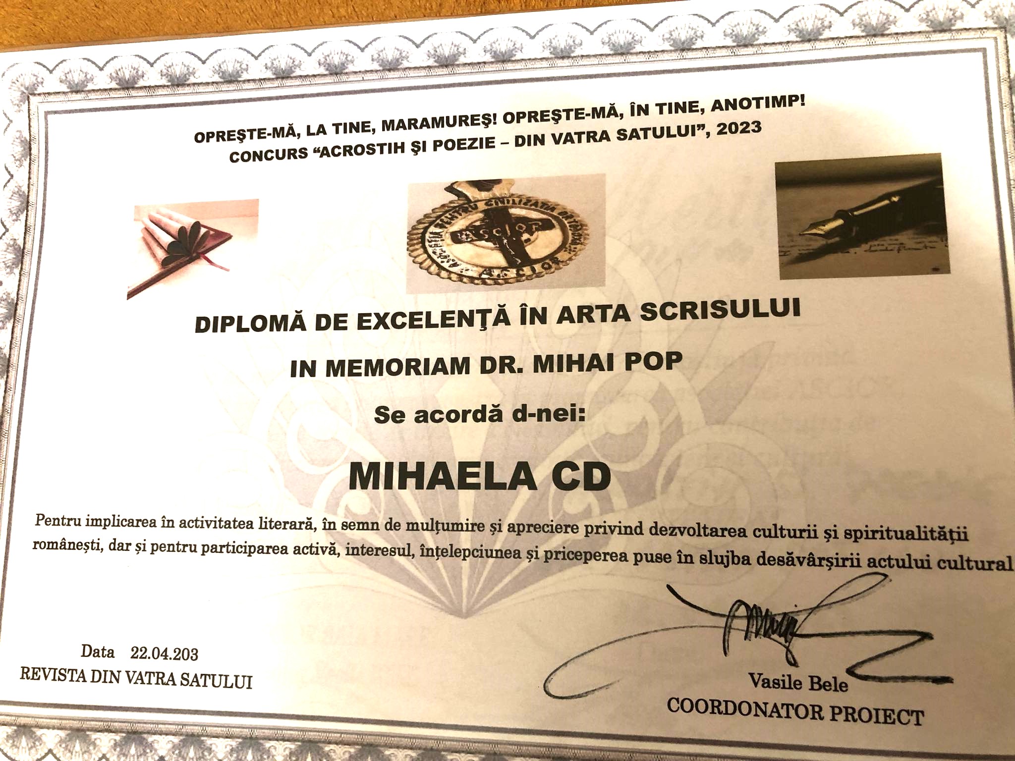 DIPLOMA DE EXCELENTA IN ARTA SCRISULUI IN MEMORIAM DR MIHAI POP mi-a fost acordata la concursul de ACROSTIH SI POEZIE -DIN VATRA SATULUI ” 2023 concurs aflat sub stindardul OPRESTE-MA LA TINE MARAMURES, OPRESTE-MA IN TINE ANOTIMP!