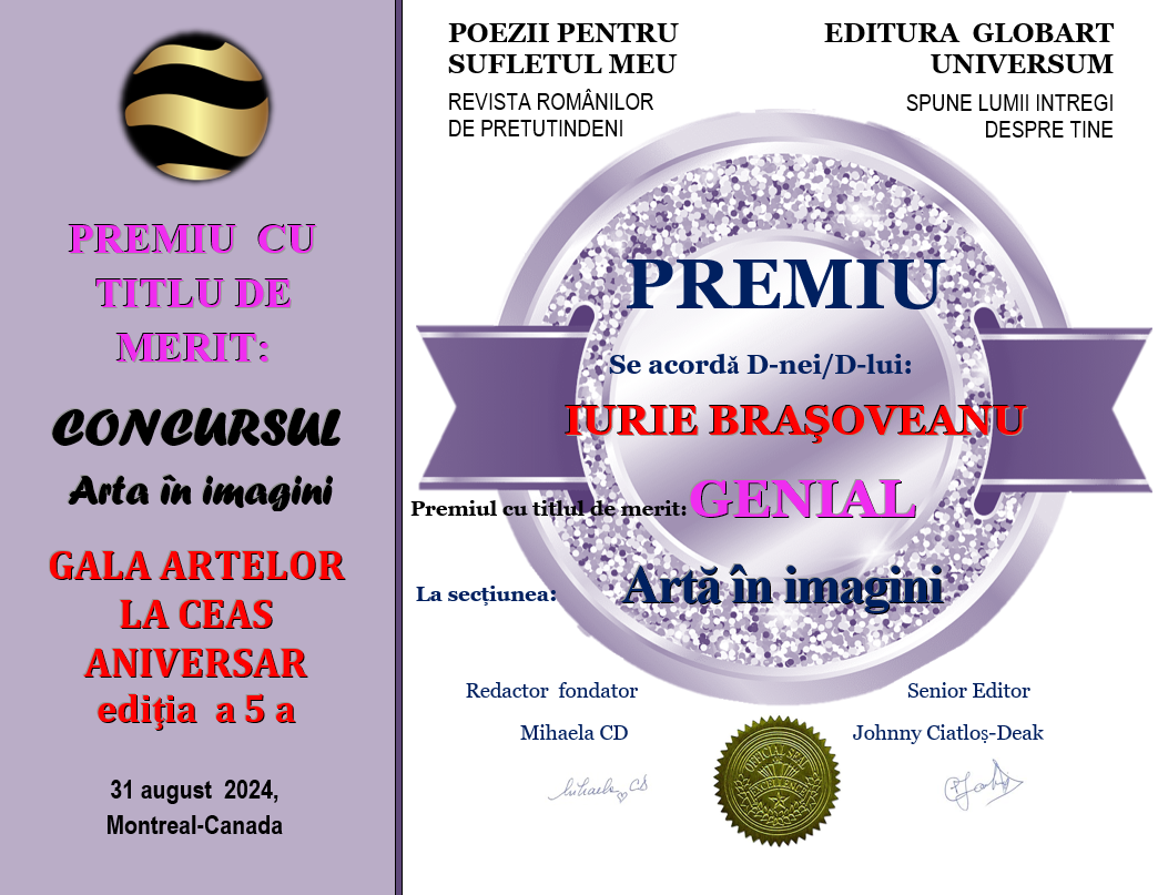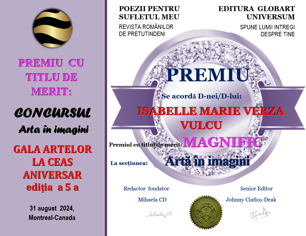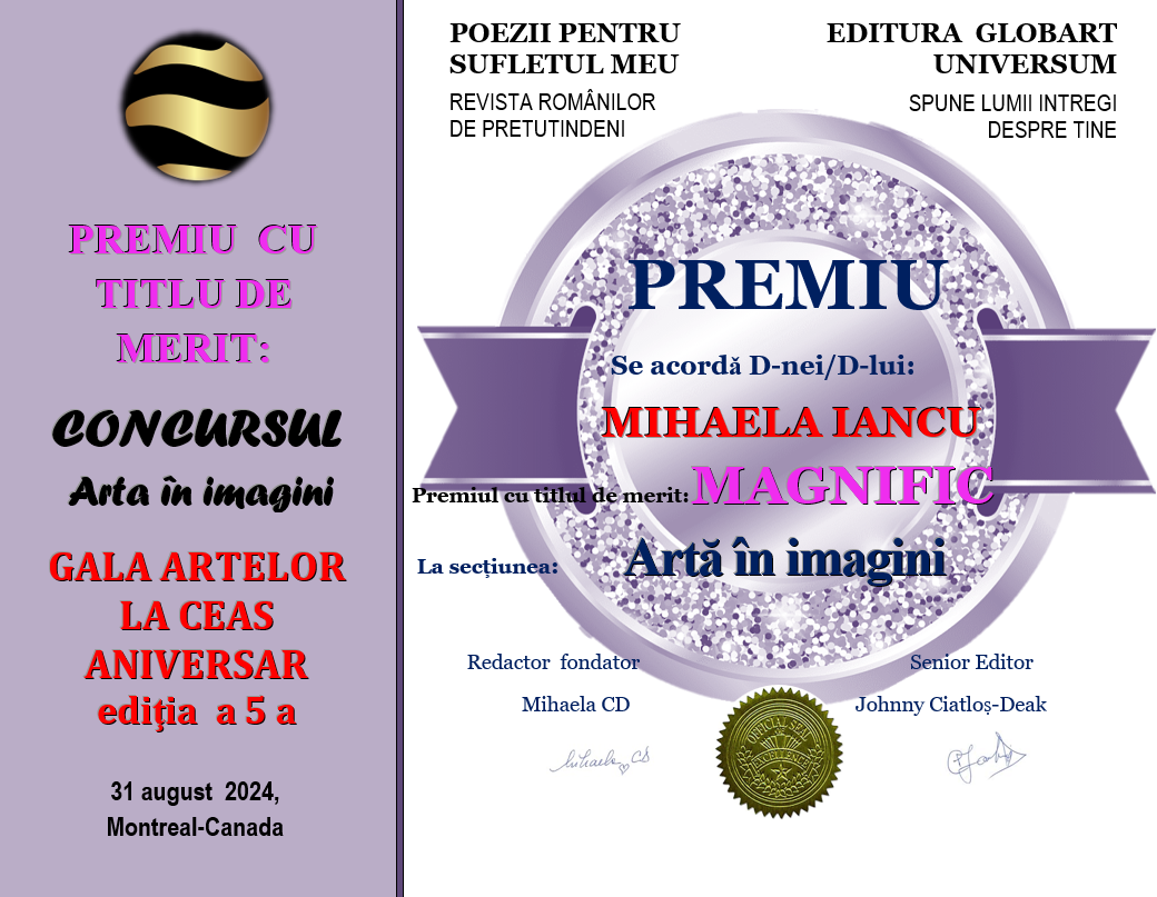 In cadrul evenimentului GALA ARTELOR editia a 5-a din 31 august 2024 Editura Globart Universum din Montreal împreună cu revista TIPĂRITĂ POEZII PENTRU SUFLETUL MEU au organizat concursul GALA ARTELOR LA CEAS ANIVERSAR ediția a 5-a desfășurat în revista numărul 16 tipărită , concurs cu 2 secțiuni: ARTA ÎN IMAGINI și CREAȚII LITERARE.