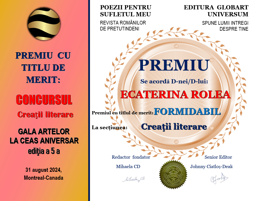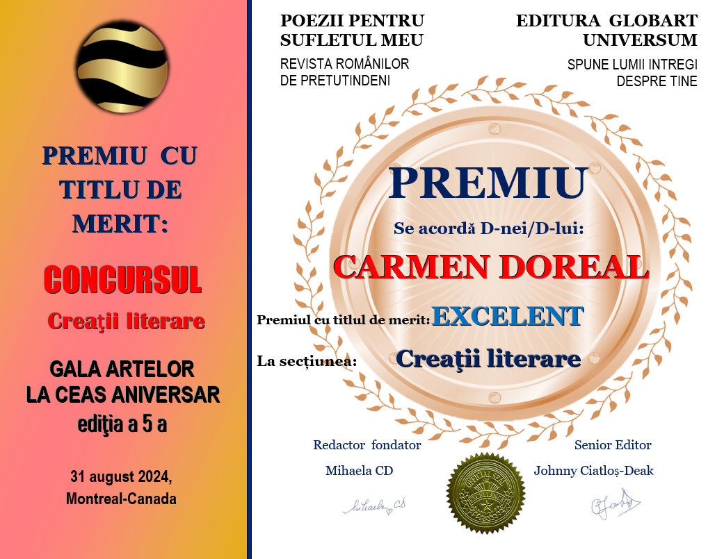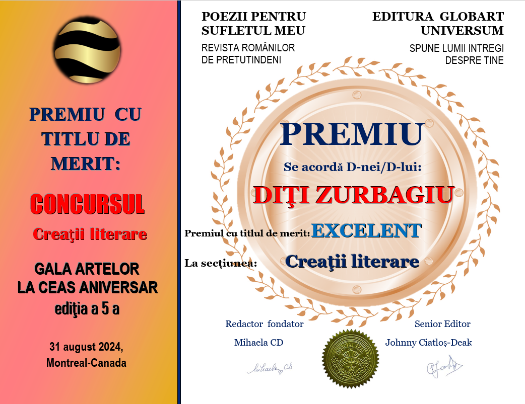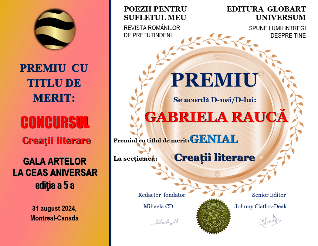 In cadrul evenimentului GALA ARTELOR editia a 5-a din 31 august 2024 Editura Globart Universum din Montreal împreună cu revista TIPĂRITĂ POEZII PENTRU SUFLETUL MEU au organizat concursul GALA ARTELOR LA CEAS ANIVERSAR ediția a 5-a desfășurat în revista numărul 16 tipărită , concurs cu 2 secțiuni: ARTA ÎN IMAGINI și CREAȚII LITERARE.