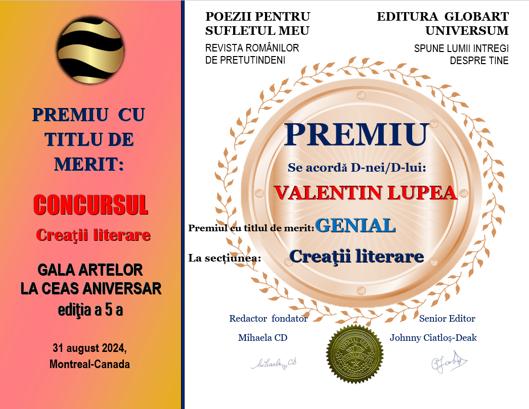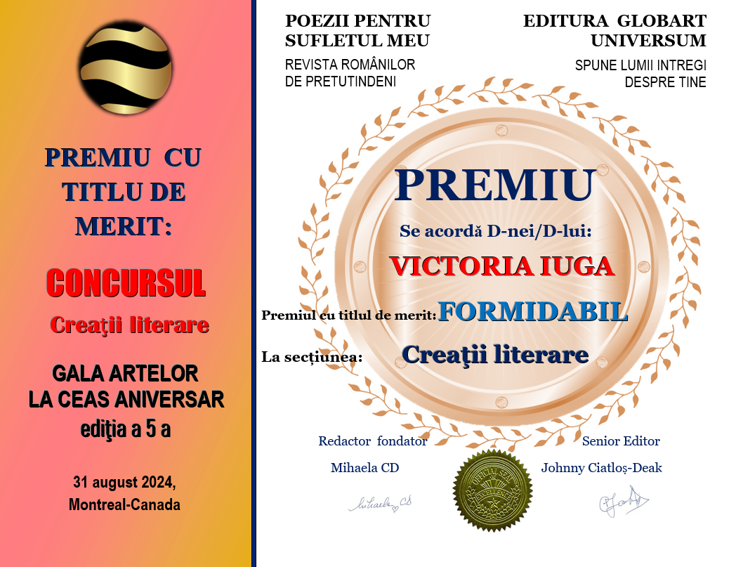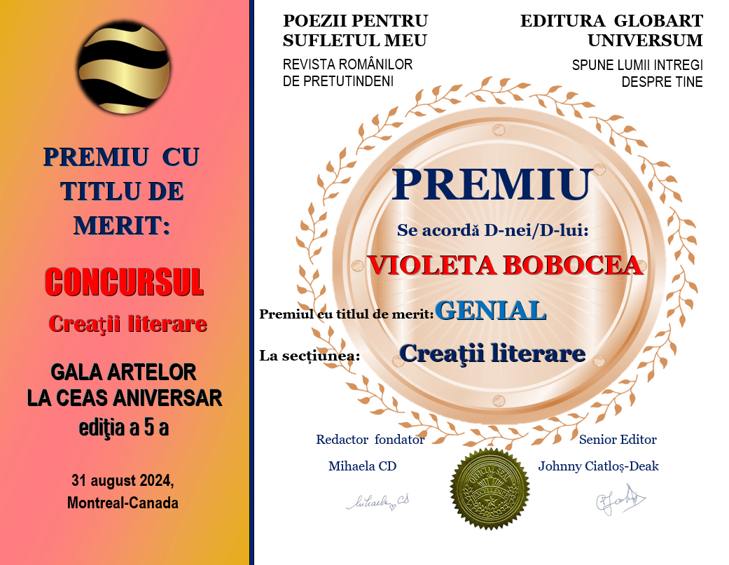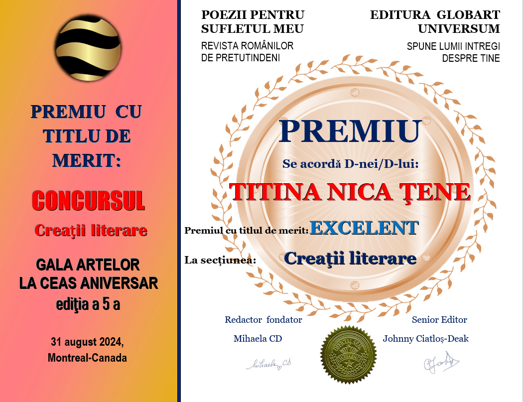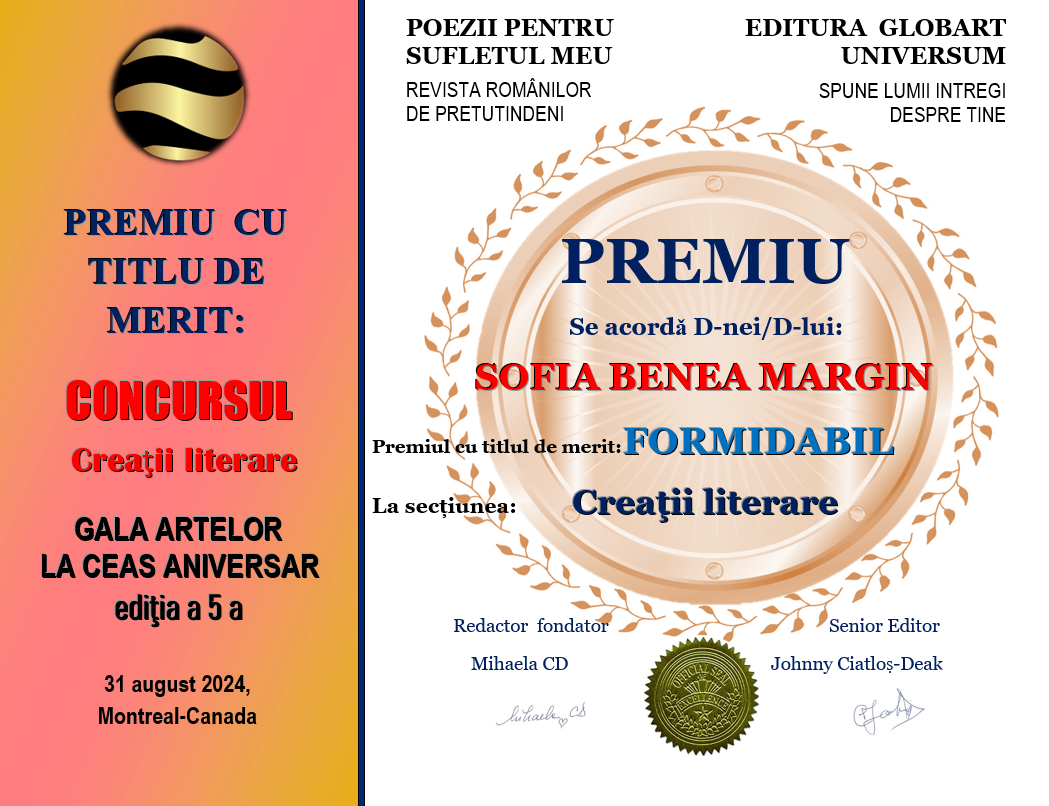 In cadrul evenimentului GALA ARTELOR  editia  a 5-a  din 31 august 2024 Editura Globart Universum din Montreal împreună  cu revista  TIPĂRITĂ POEZII PENTRU SUFLETUL MEU au  organizat concursul  GALA ARTELOR LA CEAS ANIVERSAR  ediția a 5-a  desfășurat  în revista numărul 16  tipărită , concurs cu 2 secțiuni: ARTA  ÎN IMAGINI  și CREAȚII LITERARE.