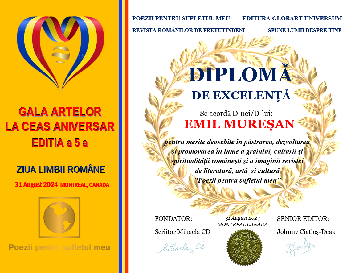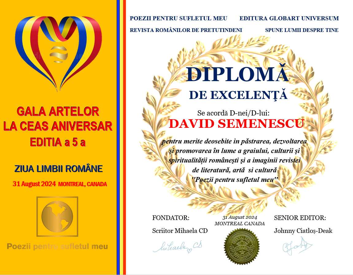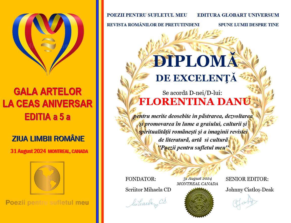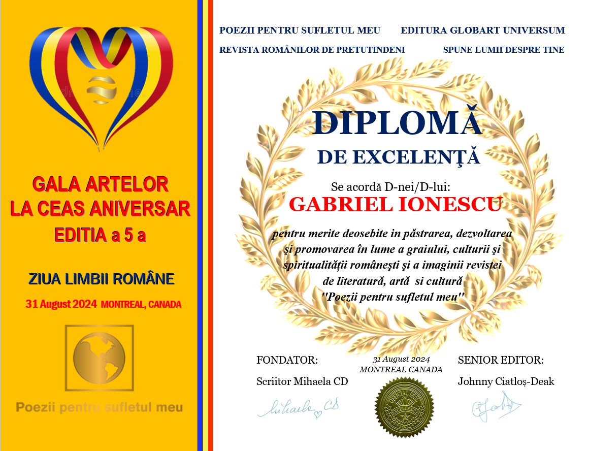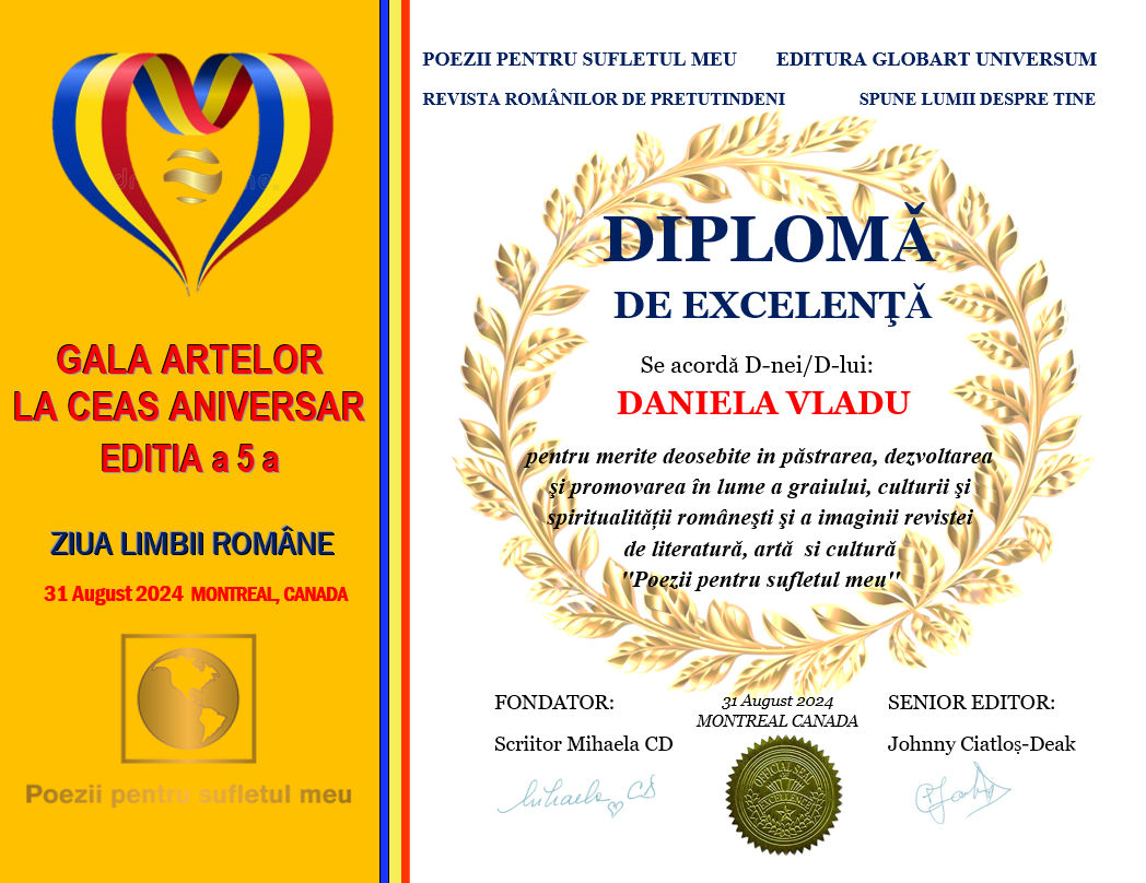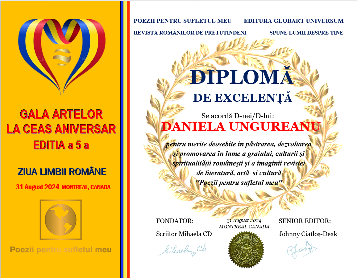 In cadrul evenimentului GALA ARTELOR ediția a 5-a din 31 august 2024 Editura Globart Universum din Montreal împreună cu revista POEZII PENTRU SUFLETUL MEU atribuie mai multe feluri de premii și diplome: Diplome de Excelenta -antologia STELARIS, Diplome de onoare membrilor clubului Gold, Premii Concursul GALA ARTELOR LA CEAS ANIVERSAR secțiuni CREAȚII LITERARE și ARTA ÎN IMAGINI ( revista tipărita nr 16), Diplomele PENIȚA DE AUR, Diplomele STEJARUL DE AUR, Diplome de Excelenta oferite la Evenimentul GALA ARTELOR din Montreal și Diplome de Excelenta oferite colaboratorilor din lumea întreagă.