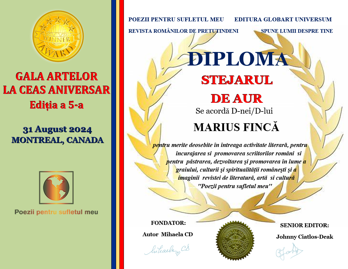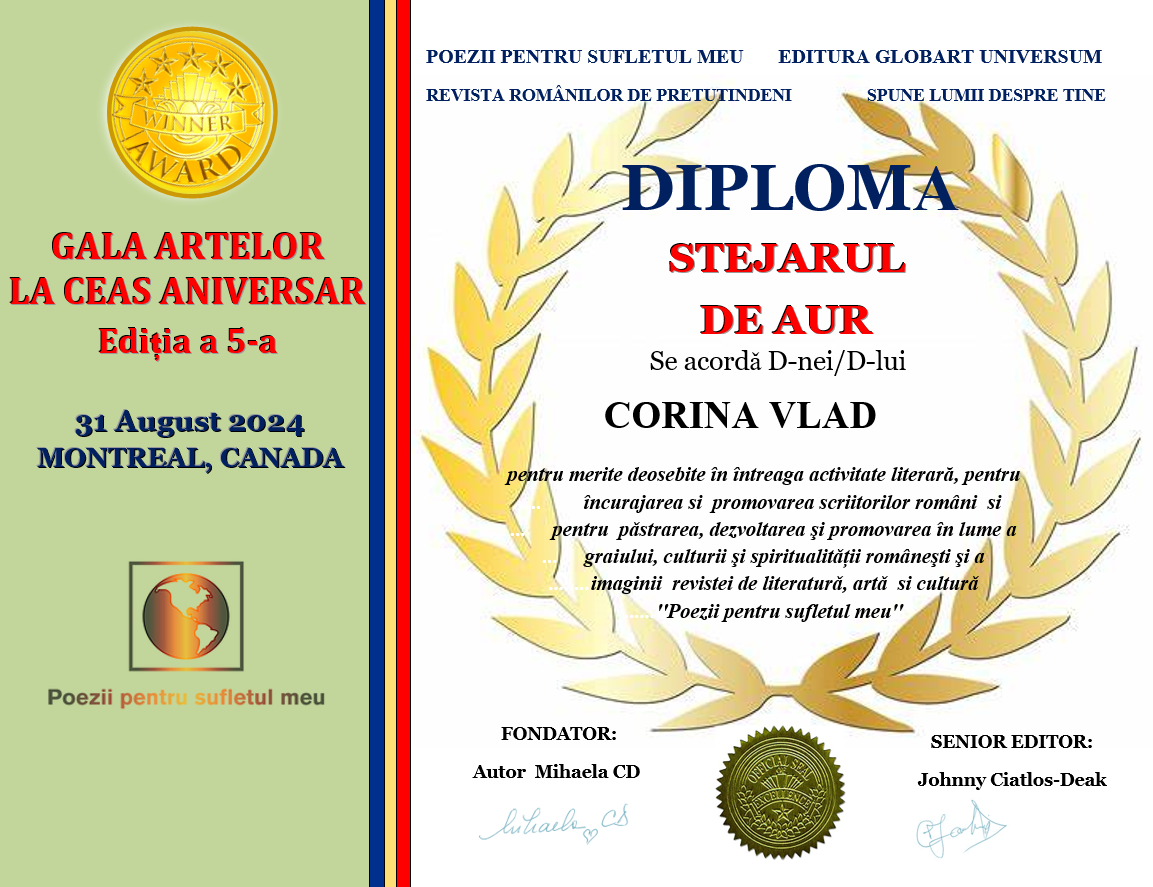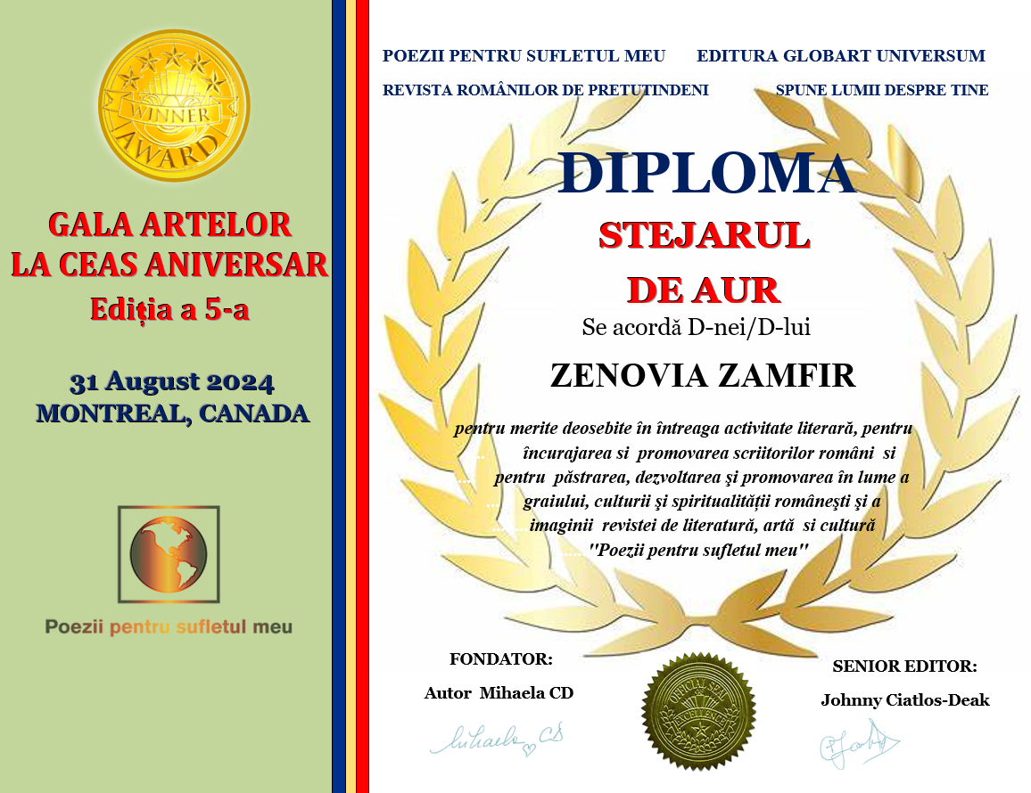 In cadrul evenimentului GALA ARTELOR  ediția  a 5-a  din 31 august 2024 Editura Globart Universum din Montreal împreună  cu revista POEZII PENTRU SUFLETUL MEU  atribuie mai multe feluri de premii si diplome.
