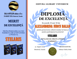 In cadrul evenimentului GALA ARTELOR editia a 5-a din 31 august 2024 Editura Globart Universum din Montreal oferă DIPLOME DE EXCELENTA însoțite de MERITUL DE EXCELENTA pentru promovarea culturii romane în lume tuturor participanților la ANTOLOGIA STELARIS-Stele ale literaturii române contemporane -3 volume, publicata în cadrul Programului de promovare al scriitorilor și artiștilor români contemporani de pretutindeni care se desfășoară an de an cu ocazia Galei Artelor.
