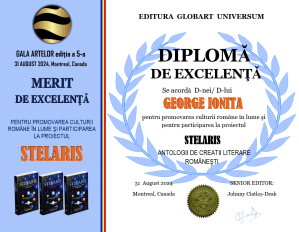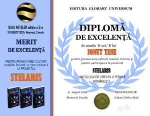 In cadrul evenimentului GALA ARTELOR editia a 5-a din 31 august 2024 Editura Globart Universum din Montreal oferă DIPLOME DE EXCELENTA însoțite de MERITUL DE EXCELENTA pentru promovarea culturii romane în lume tuturor participanților la ANTOLOGIA STELARIS-Stele ale literaturii române contemporane -3 volume, publicata în cadrul Programului de promovare al scriitorilor și artiștilor români contemporani de pretutindeni care se desfășoară an de an cu ocazia Galei Artelor.