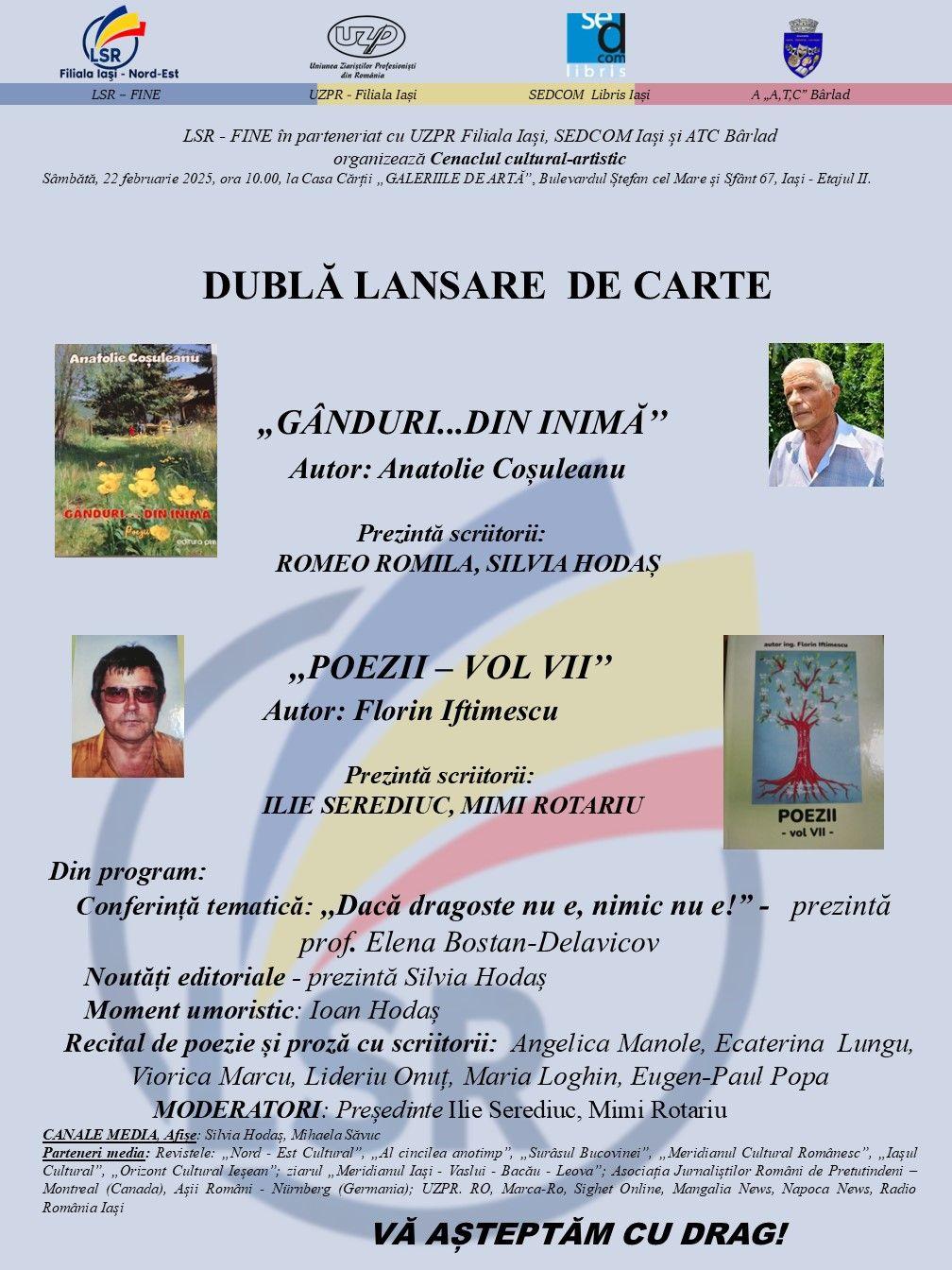 22 februarie 2025. O zi geroasă de iarnă, dar un soare strălucitor își arunca razele, dis-de-dimineață, peste cele șapte coline ale Iașului, învăluind orașul în lumină. Cu inimile calde, iubitorii de cultură s-au îndreptat spre Casa Cărții pentru a participa la un eveniment deosebit: „Dublă lansare de carte”, organizat de Liga Scriitorilor Români – Filiala Iași – Nord Est și partenerii săi.