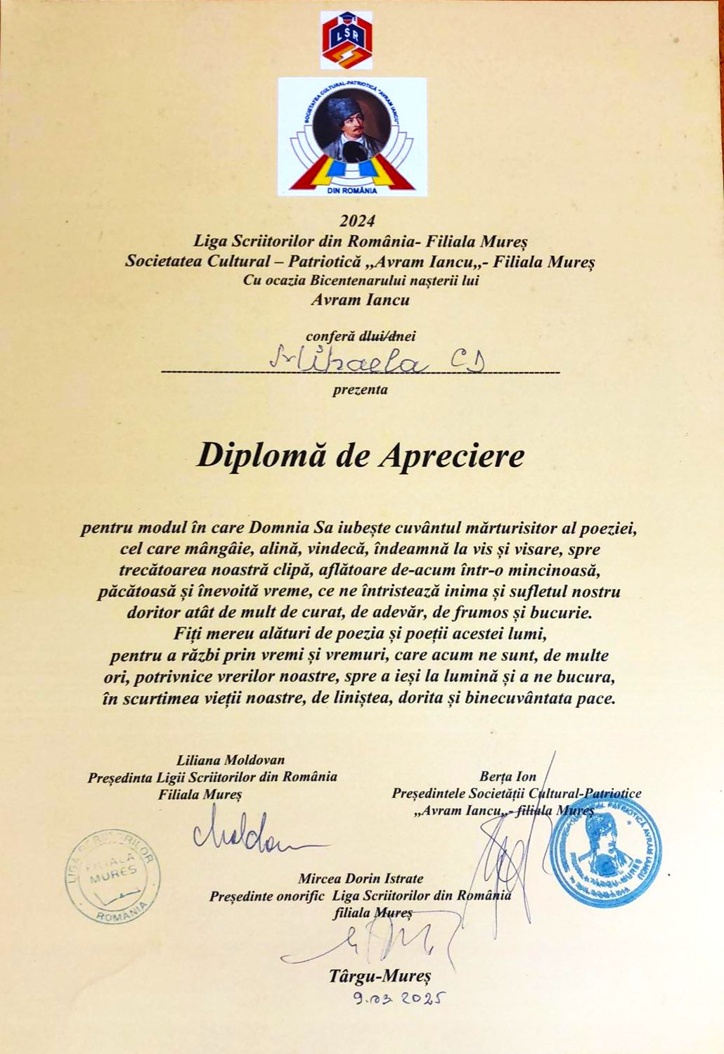 MIHAELA CD primește DIPLOMA DE APRECIERE din partea Societății cultural-patriotice Avram Iancu-FILIALA MURES