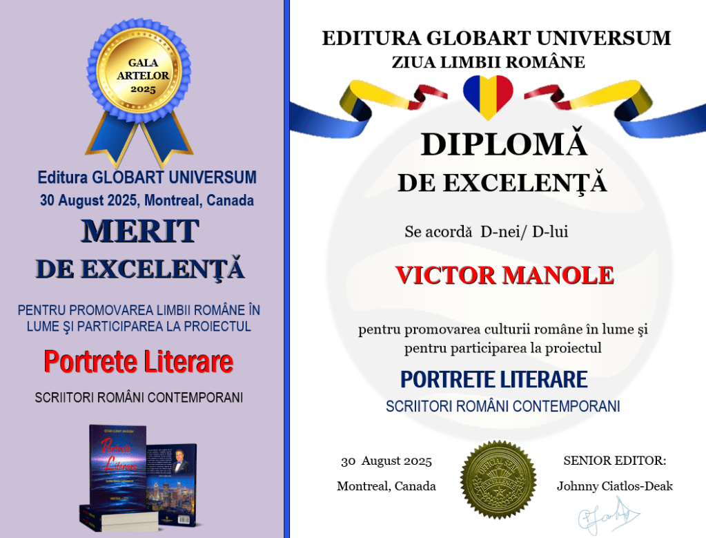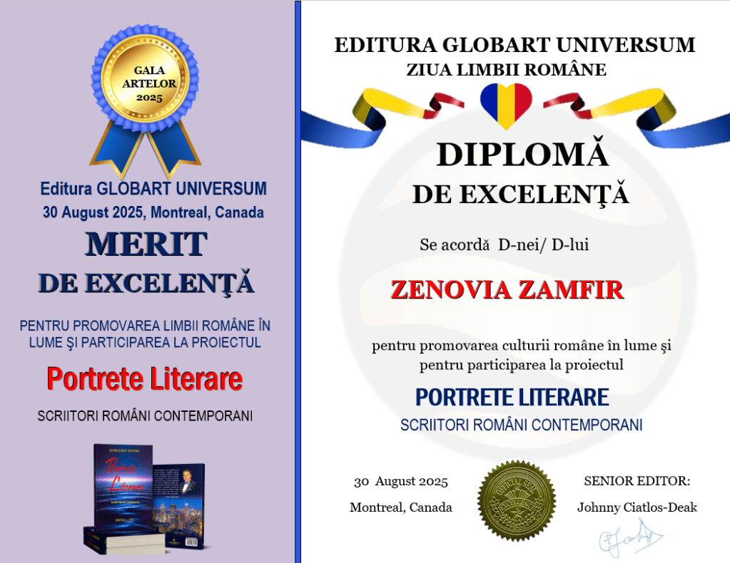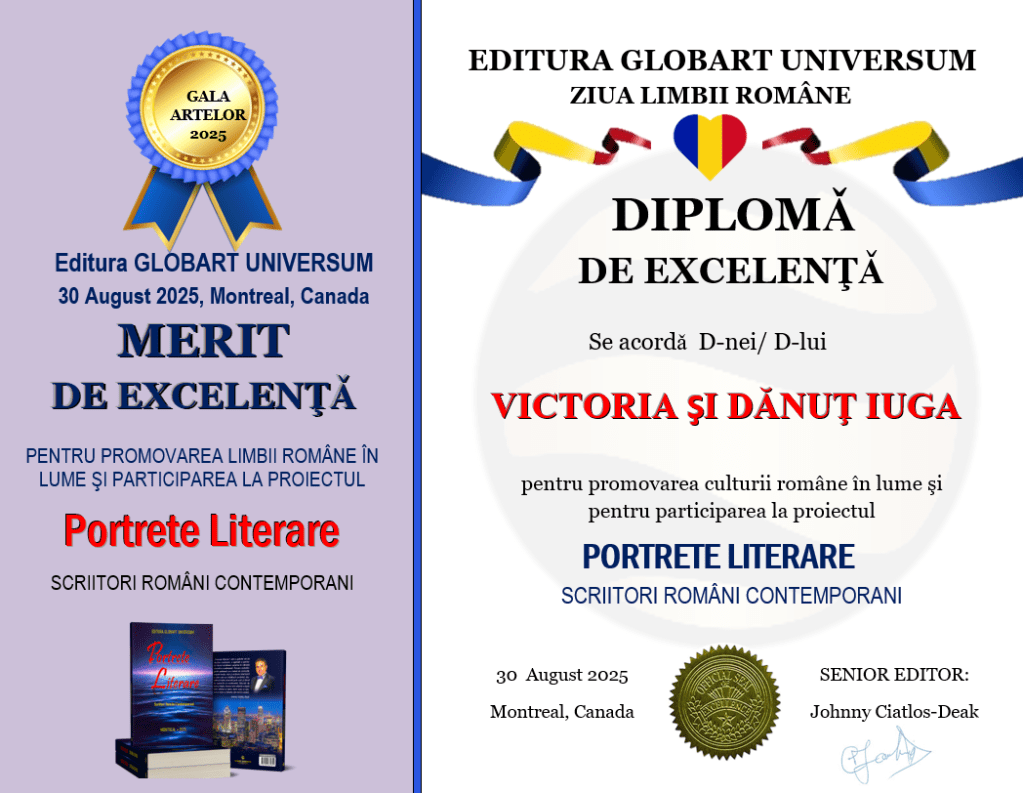 Cu ocazia ZILEI LIMBII ROMANE, in cadrul evenimentului GALA ARTELOR ediția a 6-a din 30 august 2025 Editura Globart Universum din Montreal oferă DIPLOME DE EXCELENTA însoțite de MERITUL DE EXCELENTA pentru promovarea culturii romane în lume tuturor participanților la proiectul PORTRETE LITERARE , publicata în cadrul Programului de promovare al scriitorilor și artiștilor români contemporani de pretutindeni care se desfășoară an de an cu ocazia Galei Artelor.