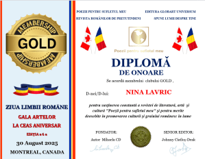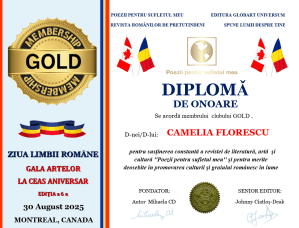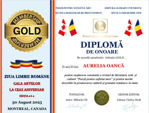 Cu ocazia ZILEI LIMBII ROMANE in cadrul evenimentului GALA ARTELOR ediția a 6-a din 30 august 2025 Editura Globart Universum din Montreal împreuna cu revista POEZII PENTRU SUFLETUL MEU oferă la fel ca în fiecare an cu ocazia Galei Artelor , DIPLOME DE ONOARE pentru SUSȚINEREA REVISTEI TIPĂRITE și pentru promovarea culturii romane în lume tuturor membrilor CLUBULUI GOLD !