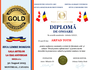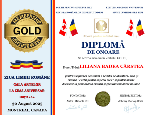 Cu ocazia ZILEI LIMBII ROMANE in cadrul evenimentului GALA ARTELOR ediția a 6-a din 30 august 2025 Editura Globart Universum din Montreal împreuna cu revista POEZII PENTRU SUFLETUL MEU oferă la fel ca în fiecare an cu ocazia Galei Artelor , DIPLOME DE ONOARE pentru SUSȚINEREA REVISTEI TIPĂRITE și pentru promovarea culturii romane în lume tuturor membrilor CLUBULUI GOLD !