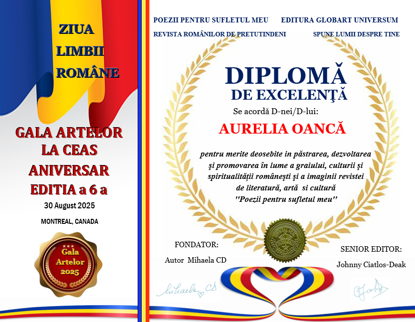 In cadrul evenimentului GALA ARTELOR  ediția  a 6-a  din 30 august 2025 Editura Globart Universum din Montreal împreună  cu revista POEZII PENTRU SUFLETUL MEU  atribuie mai multe feluri de premii și diplome: