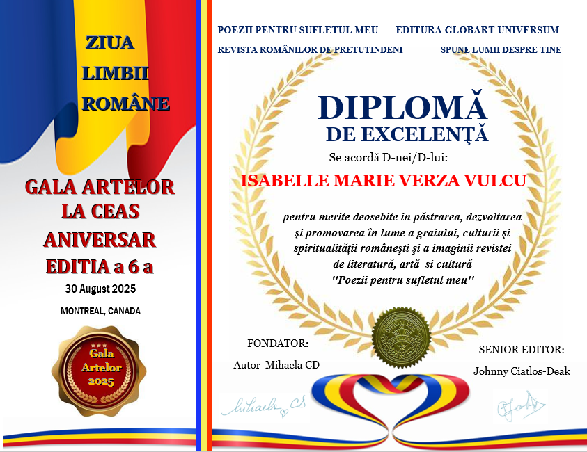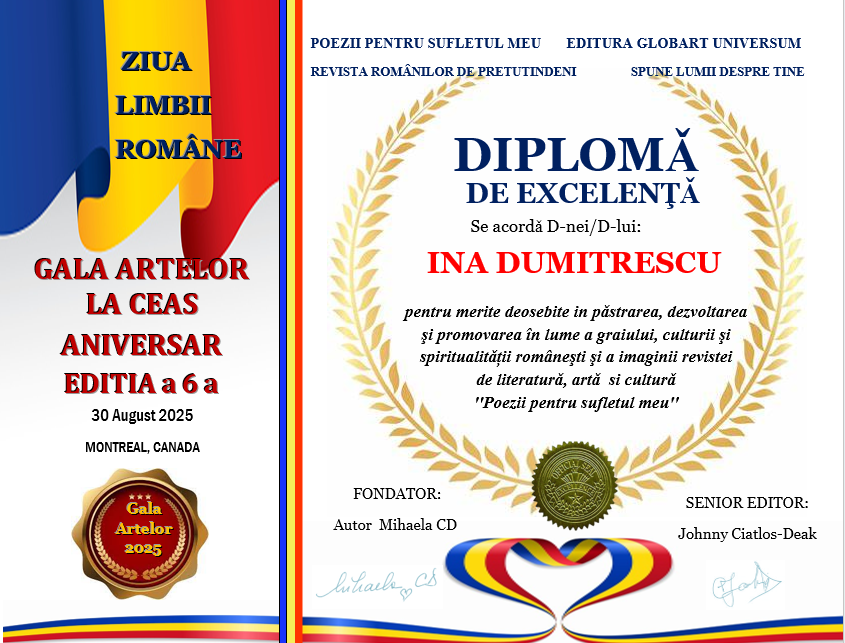 In cadrul evenimentului GALA ARTELOR ediția a 6-a din 30 august 2025 Editura Globart Universum din Montreal împreună cu revista POEZII PENTRU SUFLETUL MEU atribuie mai multe feluri de premii și diplome: