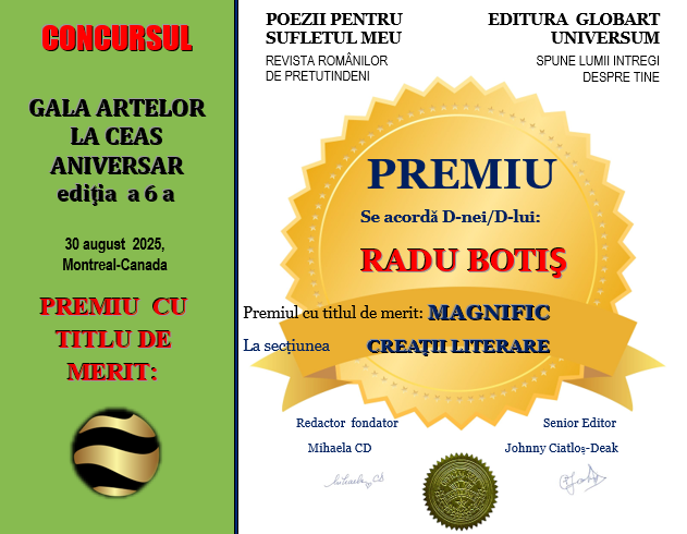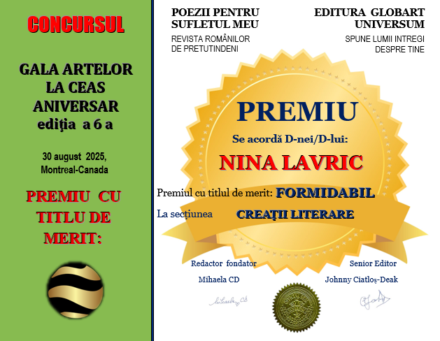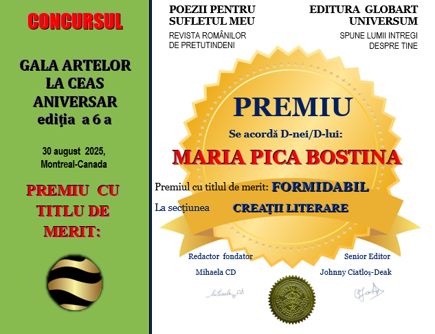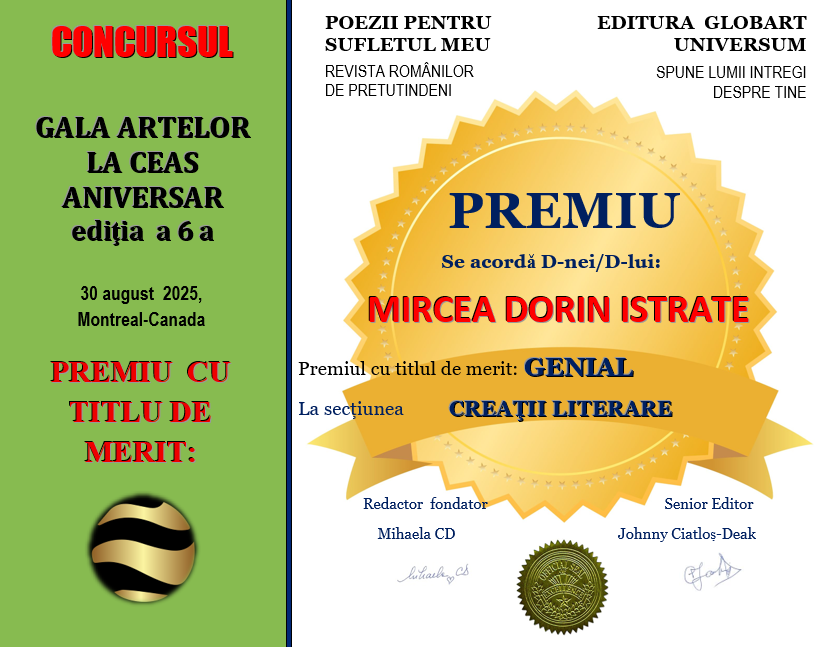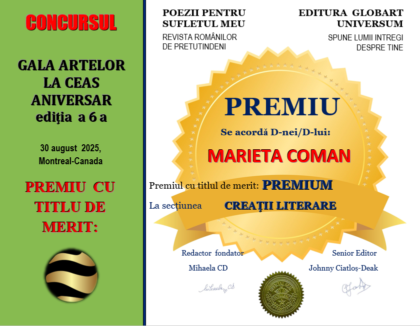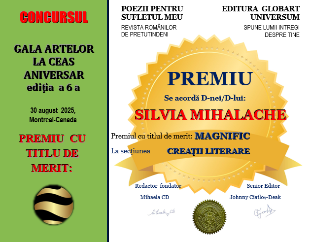 Un gând despre „PREMIILE LA CONCURSUL *GALA ARTELOR LA CEAS ANIVERSAR editia a 6-a 2025 cu participare in revista nr 20/2025-sectiunea CREATII LITERARE( literele M-S )