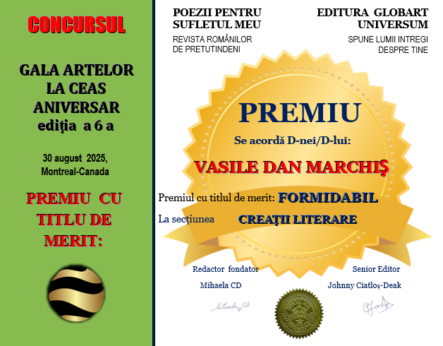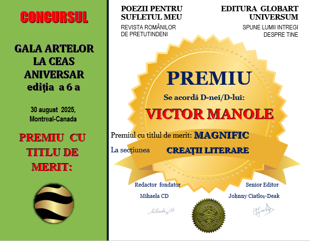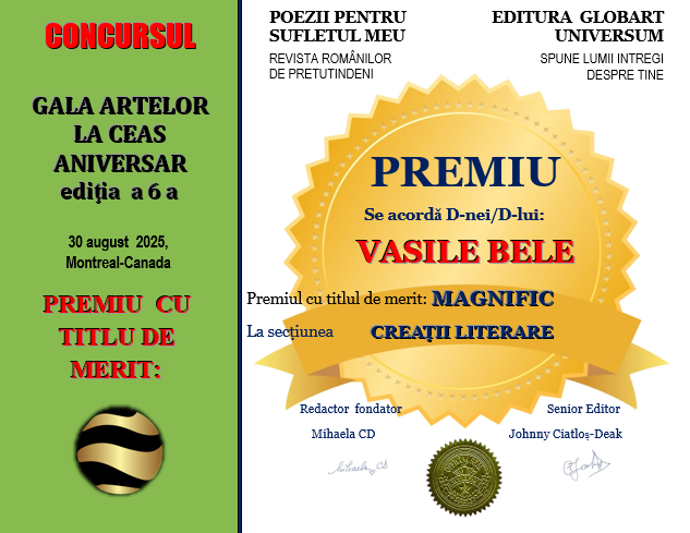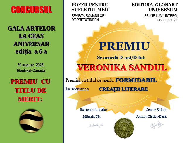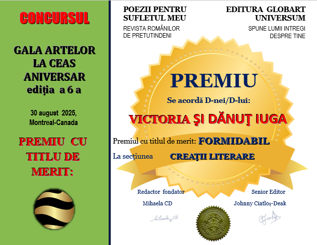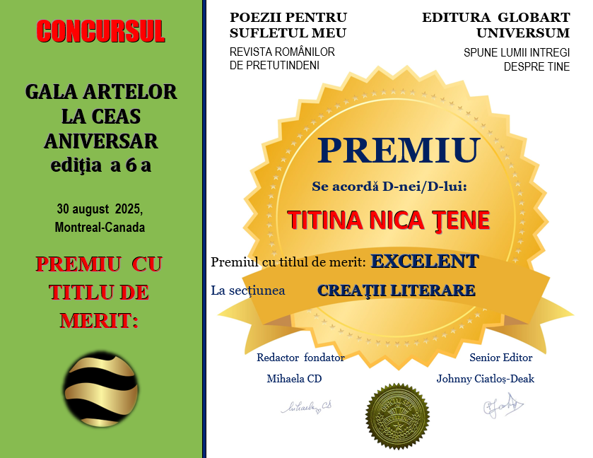 Un gând despre „PREMIILE LA CONCURSUL *GALA ARTELOR LA CEAS ANIVERSAR editia a 6-a 2025 cu participare in revista nr 20/2025-sectiunea CREATII LITERARE( literele T-V )