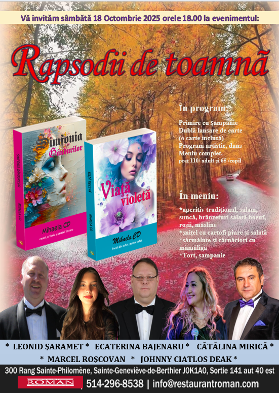 George Călinescu spunea: „Când în cetate apare o carte, toate steagurile ar trebui arborate!” O bucurie a întregii comunități, azi, pentru Românii din Montreal, care știu să cinstească acest eveniment atât de înălțător.