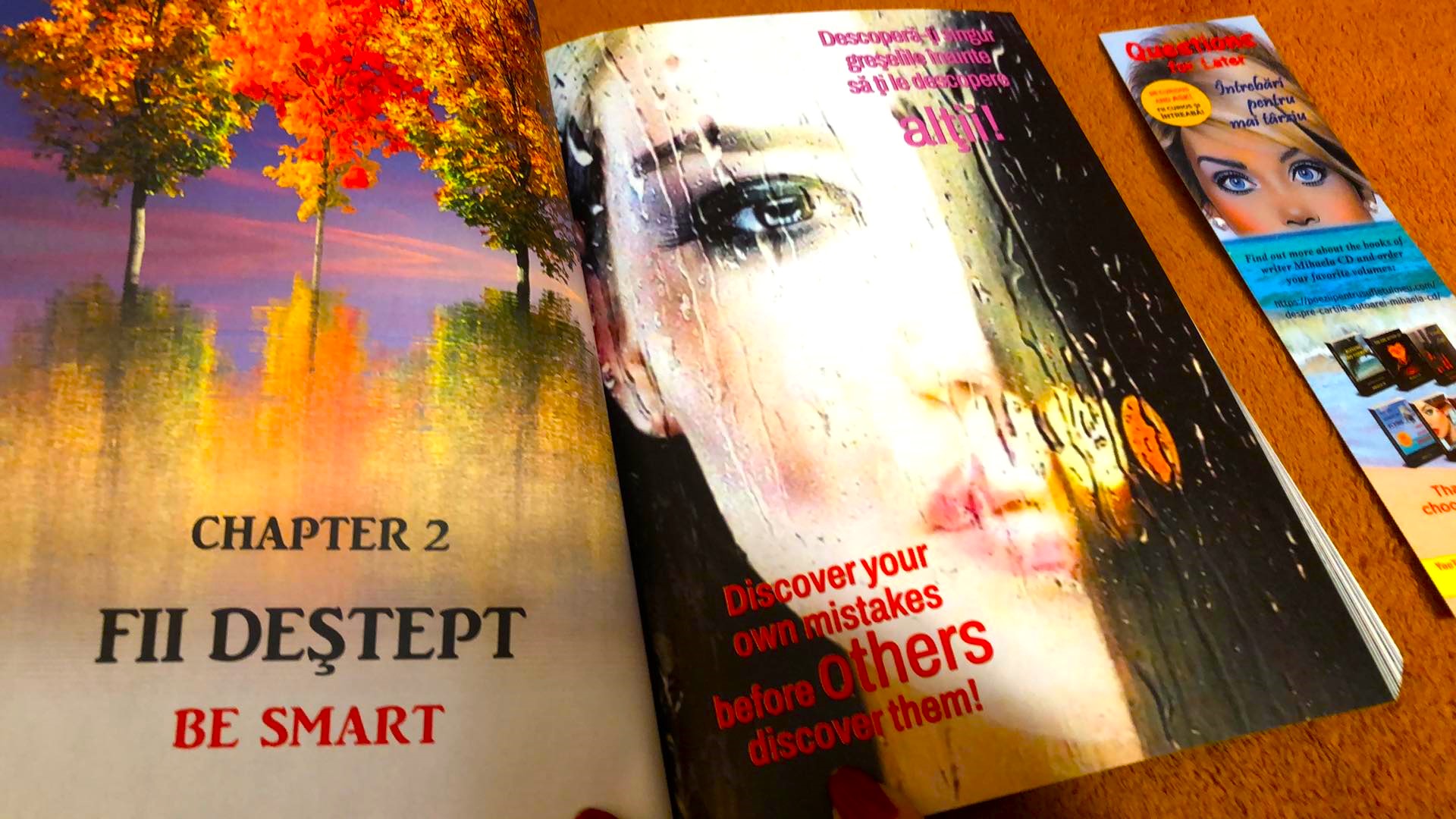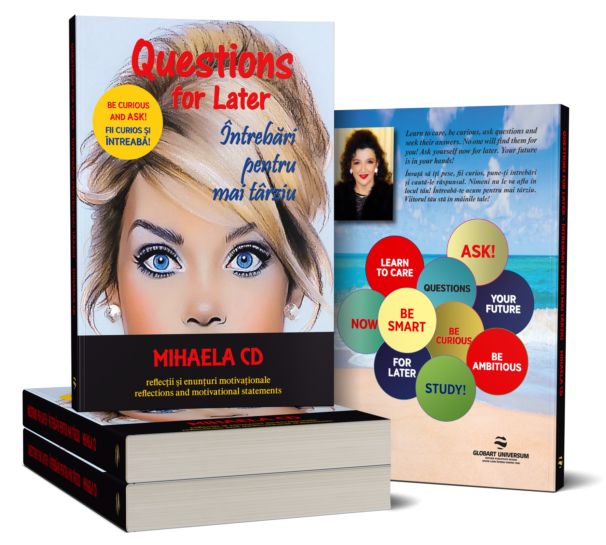 Cartea INTREBARI PENTRU MAI TARZIU/ Questions for later este o carte de reflecții și enunțuri motivaționale, bilingvă, scrisă în limba română și în limba engleză, care invită cititorul la reflecție și meditație asupra lucrurilor cu adevărat importante în viață, punandu-și întrebări la care s-ar putea să găsească răspunsul mai târziu.Cartea are 250 de pagini color și este împărțită în 17 capitole. COMANDA acum cartea in format tiparit si primesti livrare gratuita ( primele 100 comenzi) si un semn de carte gratuit.