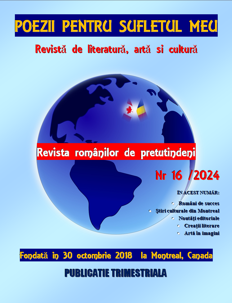 Abonament 4 numere/an. A câștigat PREMIUL LIGII SCRIITORILOR DIN ROMANIA -” PUBLICATIA LITERARA A ANULUI 2023 ” Revista de colecție de o calitate excepțională, integral color, care cuprinde literatura, arta, interviuri, articole si evenimente culturale. Aboneaza-te si colecționează fiecare număr al revistei tipărite timp de un an pentru numai 100 dolari canadieni.