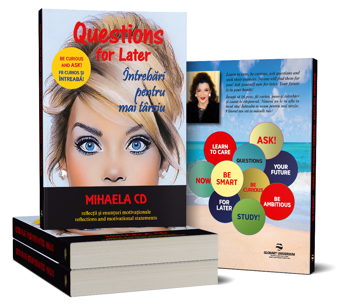 Cartea INTREBARI PENTRU MAI TARZIU/ Questions for later este o carte de reflecții și enunțuri motivaționale, bilingvă, scrisă în limba română și în limba engleză, care invită cititorul la reflecție și meditație asupra lucrurilor cu adevărat importante în viață, punandu-și întrebări la care s-ar putea să găsească răspunsul mai târziu.Cartea are 250 de pagini color și este împărțită în 17 capitole. COMANDA acum cartea in format tiparit si primesti livrare gratuita ( primele 100 comenzi) si un semn de carte gratuit.