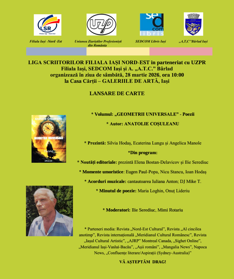 „O altă zi, încă o carte și-a început călătoria către sufletele cititorilor. «Geometrii Universale», al 5-lea volum de poezii al ieșeanului Anatolie Coșuleanu, a fost motivul reîntâlnirii la Casa Cărții a iubitorilor de cuvinte frumoase, sub egida Ligii Scriitorilor Români.”