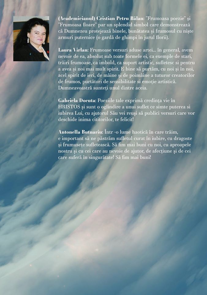 Versuri frumoase, pătrunzătoare. Sufletul , invocat in aceasta poezie , cred ca a redeșteptat întreg universul si o sa aveți in continuarea vieții numai pace, senin si zâmbet pe fata. La așa poezie, natura va oferă florile ei.Poezia este minunata! Sa nu renuntati vreodata sa scrieti versuri! Doamna Teo Razboianu inseamna, pentru noi, romanii, muzica, vers, suflet! Va iubesc! Va imbratisez ,cu toata dragostea,multumesc pentru poeziile pe care le citesc si imi lumineaza sufletul !
