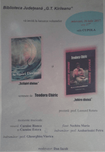 Teodora Chiric aduce oscilaţia dintre linişte şi furtună, în „Iubire divină”, într-o peisagistică unde sufletul se deschide de la sine. Autoarea se găseşte ancorată în propriile-i simţiri cu care împreună, dacă e de zburat, ea zboară. Însă niciodată nu uită unde e pământul originar.